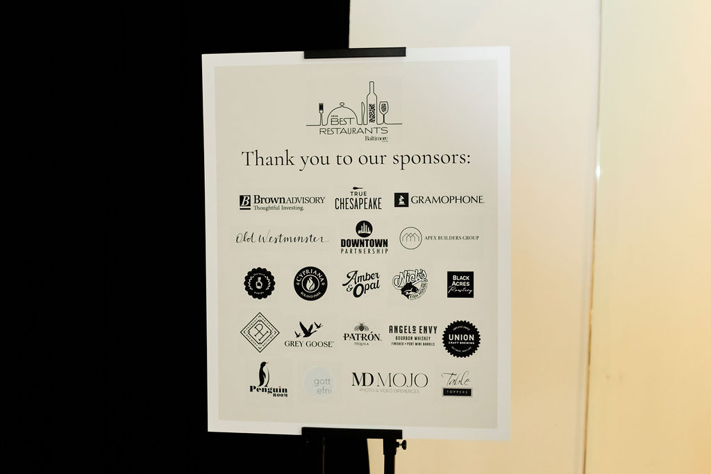 Thank you to our sponsors: True Chesapeake, Brown Advisory, Apex Builders Group, Gramophone, Downtown Partnership of Baltimore, Cypriana, Yia Yia’s Bakery, Black Acres Coffee Roastery, Amber & Opal, Nick’s Fish House, Peabody Heights Brewery, Grey Goose Vodka, Patron Tequila, Angel’s Envy, Union Craft Brewery, MD Mojo Photo, Gott Efni, Baltimore’s Premier Event Solutions, Old Westminster Winery, Table Toppers