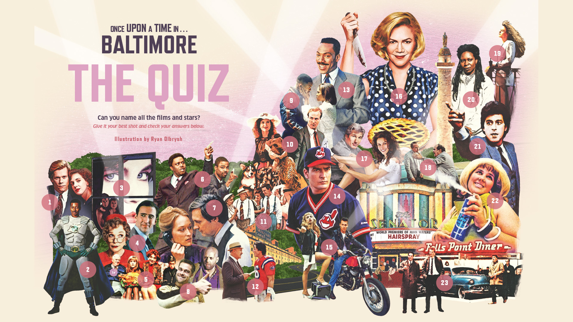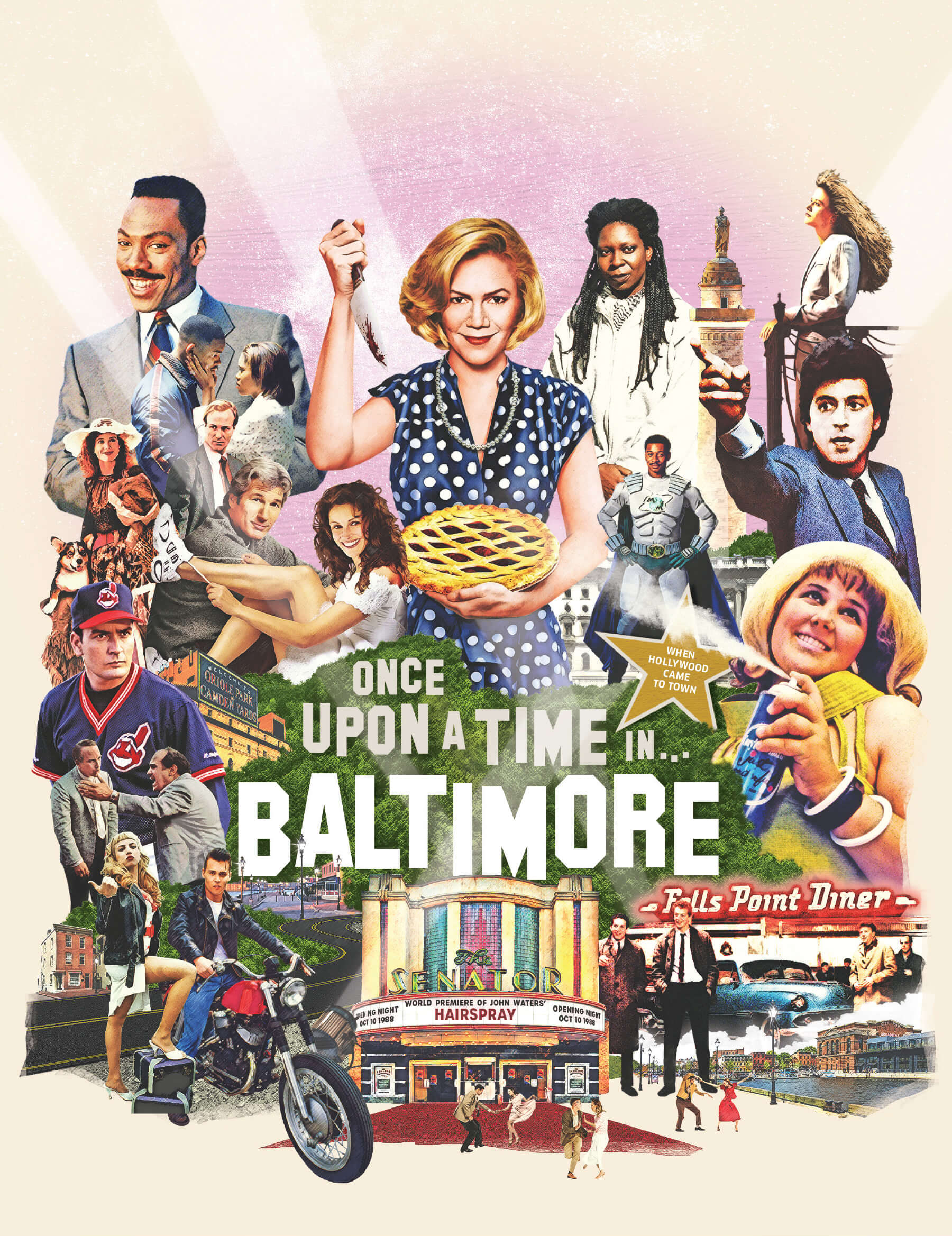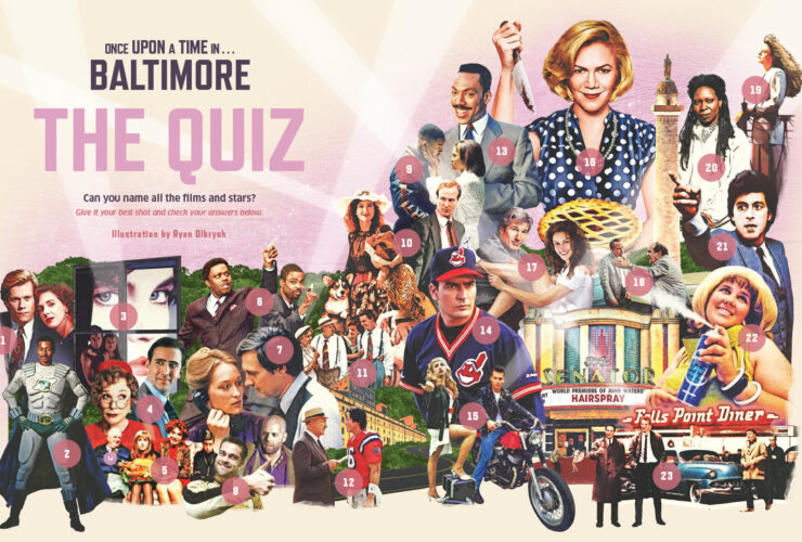 A few years after Baltimore’s original 1974 Charm City marketing campaign, Mayor William Donald Schaefer pivoted to Hollywood to rebrand Baltimore as a cultural hub. Why not? It’s a glamorous business and movies can be delightful. And the careers of native sons Johns Waters and Barry Levinson were taking off. During an era spanning the 1980s and 1990s (with spillover), the big studios shot a lot of movies here and, believe it or not, spotting a Richard Gere and Julia Roberts in Hampden, while always fun, wasn’t all that unusual. Here are some of the better-known films shot here. —Ron Cassie