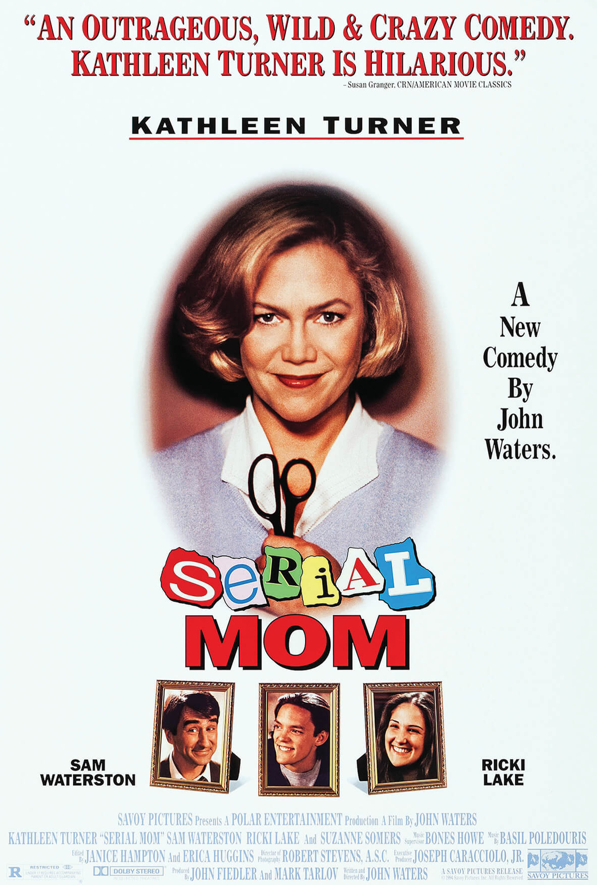Written and directed by John Waters; Starring Kathleen Turner, Sam Waterston, Ricki Lake, Suzanne Somers. Plot: A picture-perfect suburban mother and homemaker will literally commit murder over the slightest offenses to keep her children content.