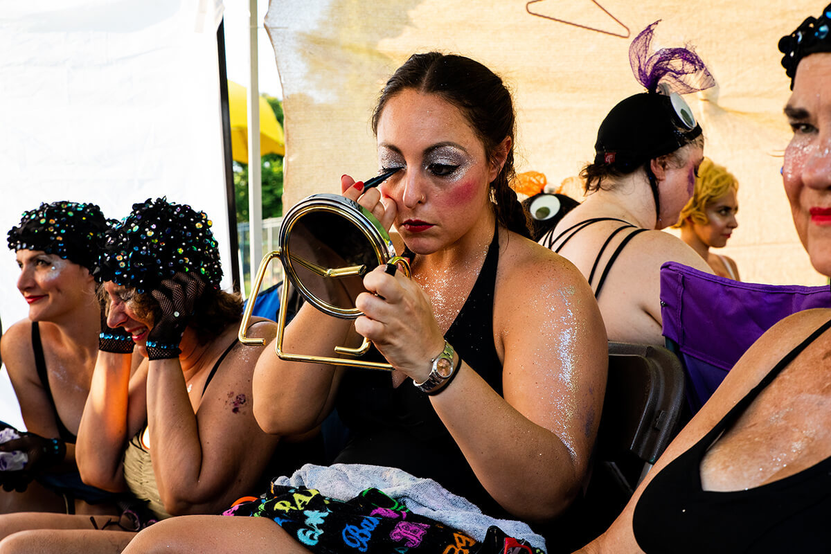 Swimmers dressed as birds, police officers, and telephone buttons mill about, looking nothing like what comes to mind when you hear the words “synchronized swimming.” The Fluid Movers come in all shapes and sizes, range from elementary school to retirement age, and few are professional performers. But this is an art form, one that’s been pretty much perfected over the past two decades. Within a half hour, the deck is a bonafide stage. Sound is ready, makeup is done, props are prepared, and rehearsal begins.