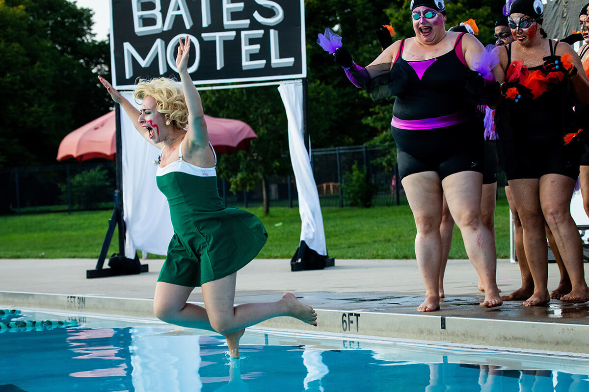 The dozens of people gathered here to transform the Baltimore pool deck from an aging public space into a functioning theater are members of Fluid Movement, a performance art group that, for the past 20 years, has brought their imaginative shows to communities across the city. For two weekends from July into August, they transform the pools and put on nine shows for crowds packed into the bleachers at Druid Hill and Patterson Parks. Past themes have included Cleopatra and Jeff Goldblum, The War of 1812 and shark-ified Shakespeare, among other things. And their latest creation, “Alfred Hitchcock Presents: The Water Ballet,” premieres in just two days.