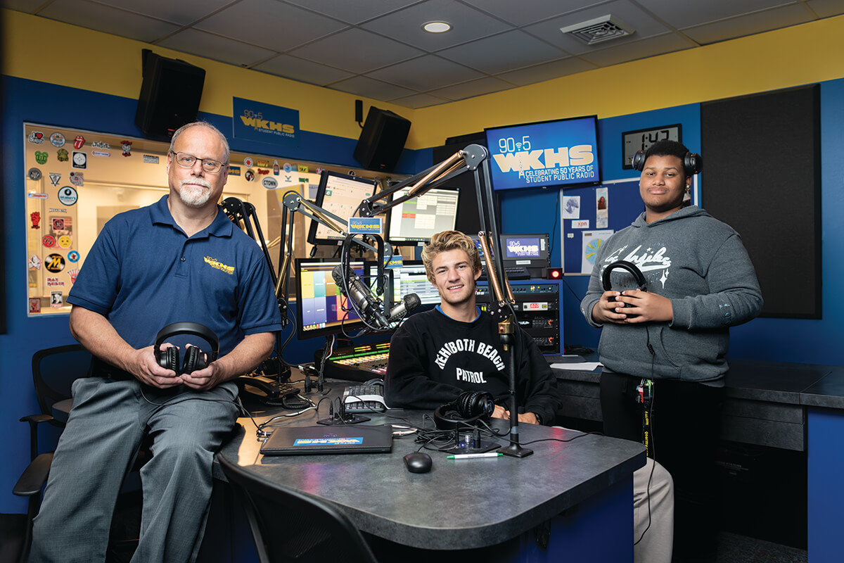 Singleton, pictured above with students Lynden Saunders and Adrean Johnson, was, is, right. WKHS, 90.5 on your FM dial, is not just some small, in-house-only school station. Founded in 1974—Elton John’s “Rocket Man” was the first song they ever played—it remains one of the most powerful high school stations in the country and the only high school station in the state.