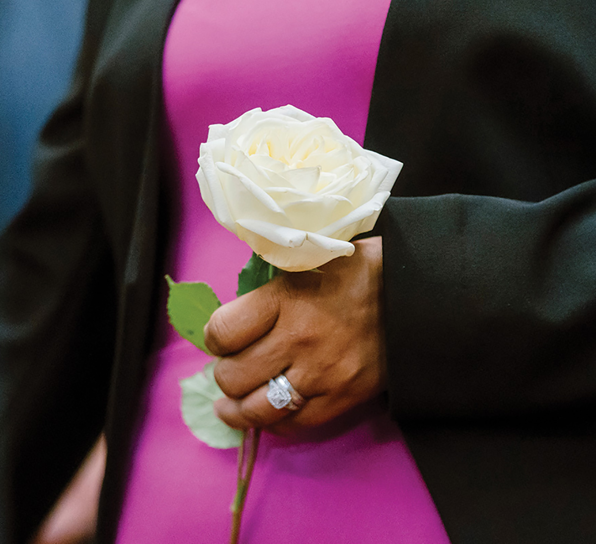 THE WIFE OF A KEY BRIDGE VICTIM HOLDING A FLOWER. —PHOTOGRAPHY BY WESLEY LAPOINTE