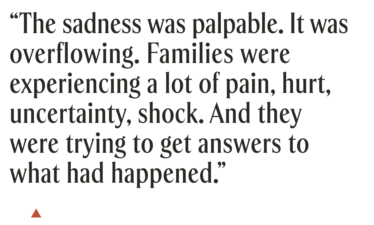 “The sadness was palpable. It was overflowing,” recalls Walker, adding that even as someone whose vocation is consoling those in grief, he had never witnessed anything like the emotion of that day. “Families were experiencing a lot of pain, hurt, uncertainty, shock. And they were trying to get answers to what had happened. What was the state of recovery? Was it possible anyone might have been alive? It was very tough for them.”