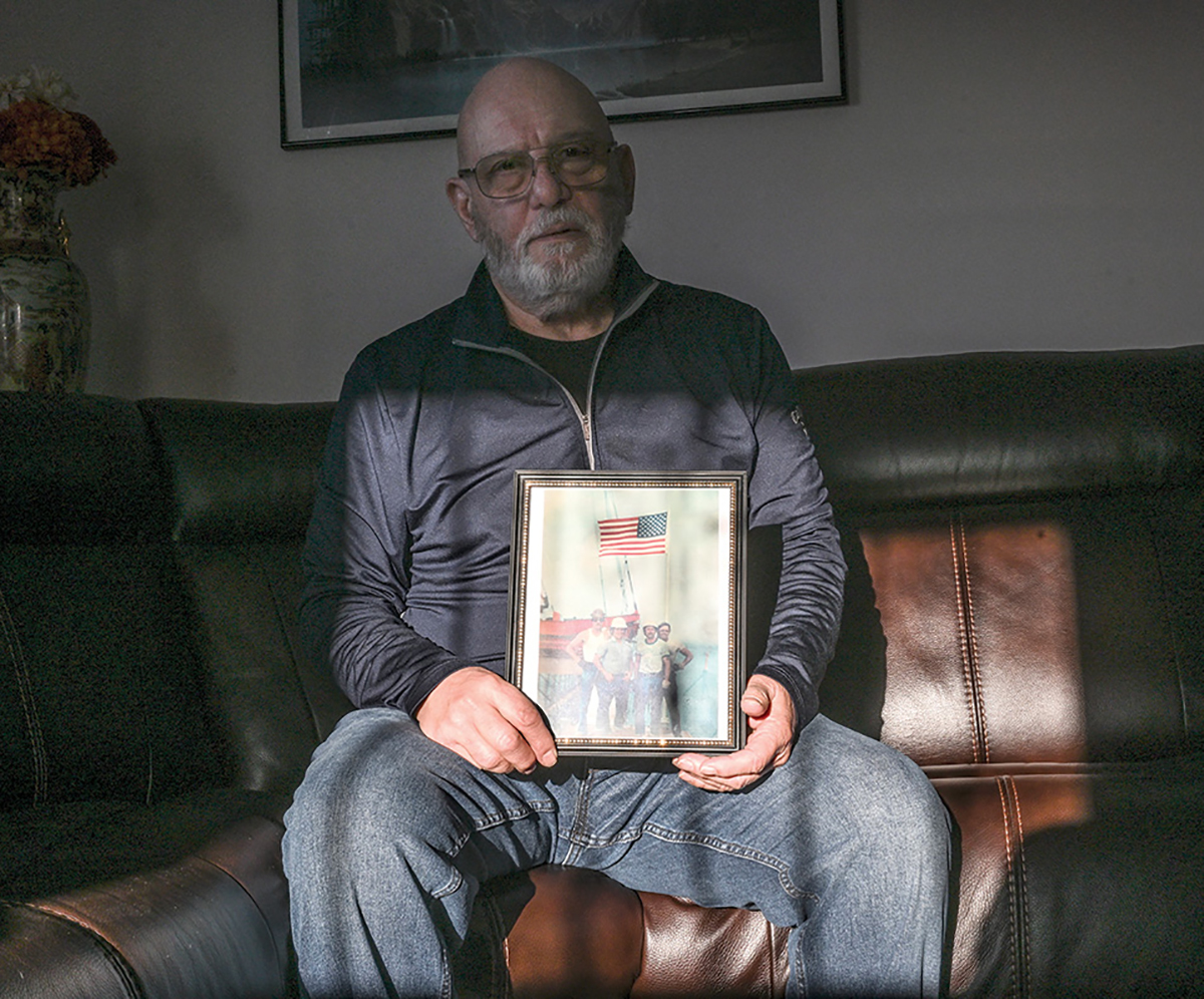 Retired Local 16 Ironworker Frank Piccione with a photo of his Key Bridge crew.—Photography by J.M. Giordano