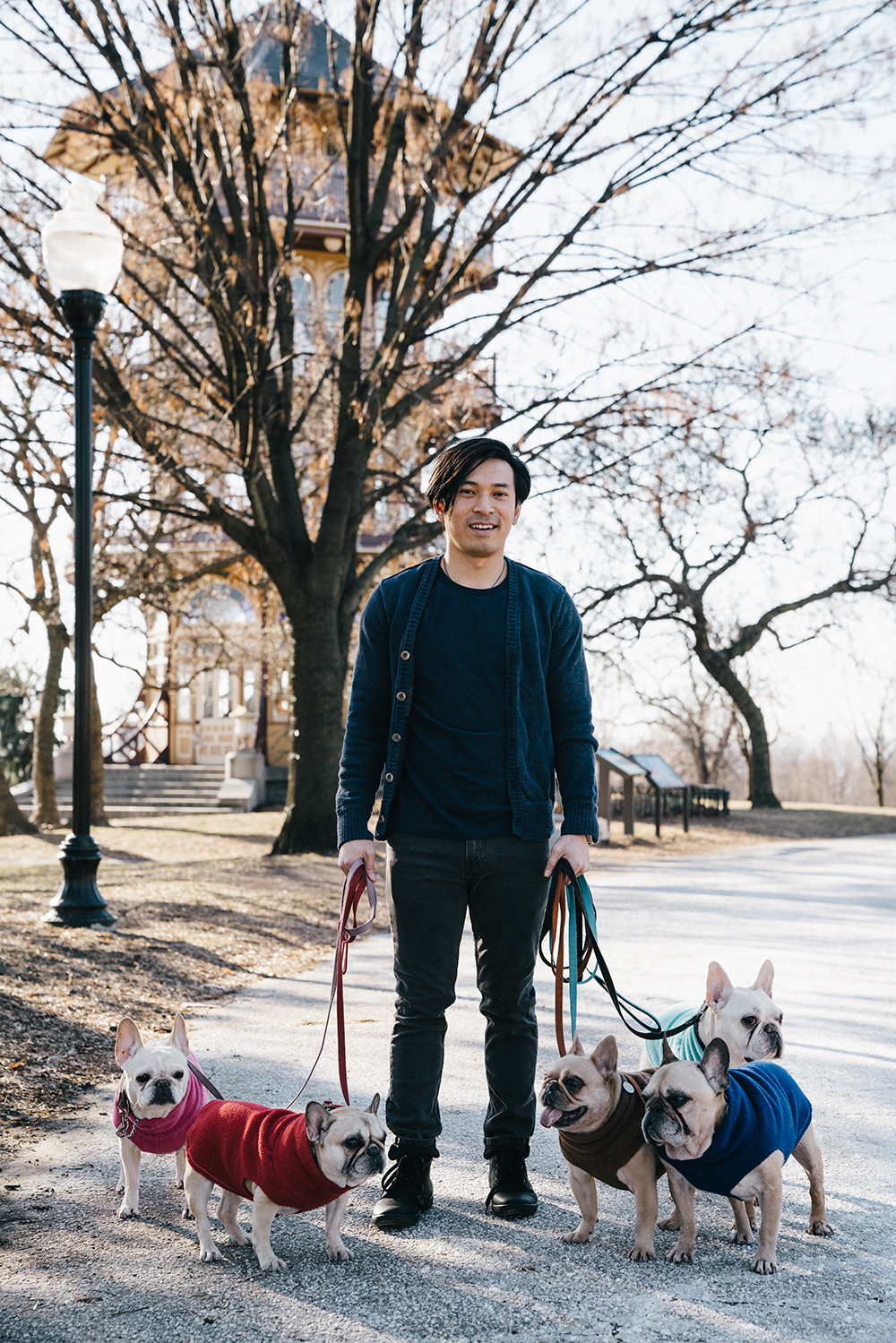 In 2006, he bought his first, Mango, a classy “gentleman,” and before long wanted to help more Frenchies by adopting them. A decade later, he still has Mango, now age 12, as well as Vespa, 7, the “lazy cuddler,” Coconut, 7, “the cheerleading squad captain,” Moped, 5, “the football team captain,” and Chopper, 3, aka “Baby Chops, the Energizer bunny.”