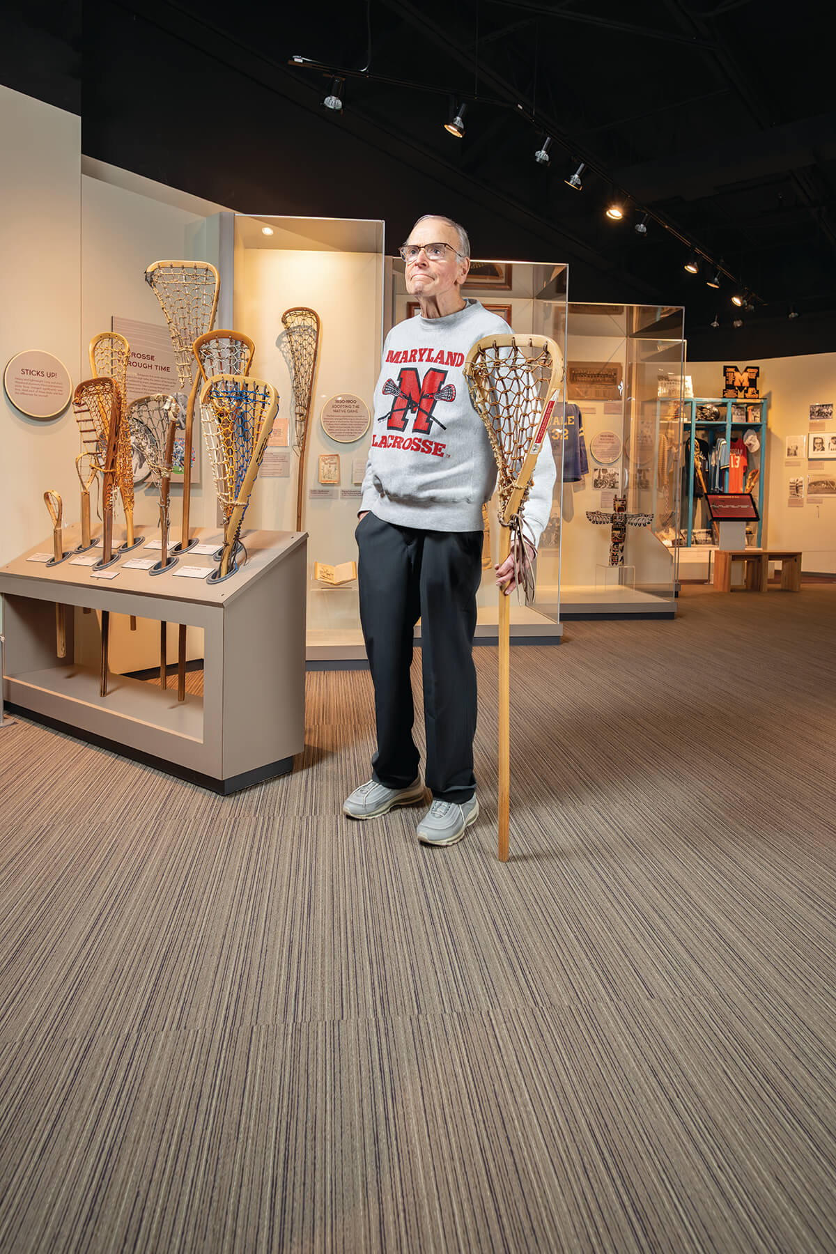 A few feet away, though, visitors learn that lacrosse’s origin story dates back even further. About a dozen wooden sticks of various shapes and sizes highlight the sport’s Native American heritage and different forms of the game played as early as the 11th century.