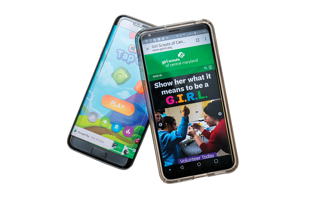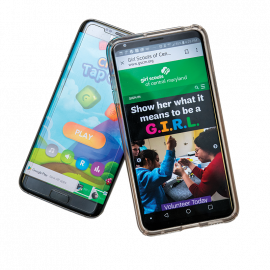 My phones. Believe it or not, I carry two. I like to be able to snap photos and selfies of friends and Girl Scouts. I also use them for relaxation when I play Crazy Cube or Sudoku.