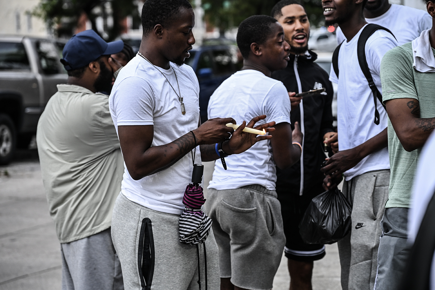 Shiny blue and black balloons released at the vigil were blown into trees by the passing storm. White tea candles that spelled out “BJ” and formed a heart rarely stayed lit due to the high winds. But that didn’t deter family members from celebrating the memory of an arabber and friend who looked out for his community.