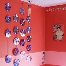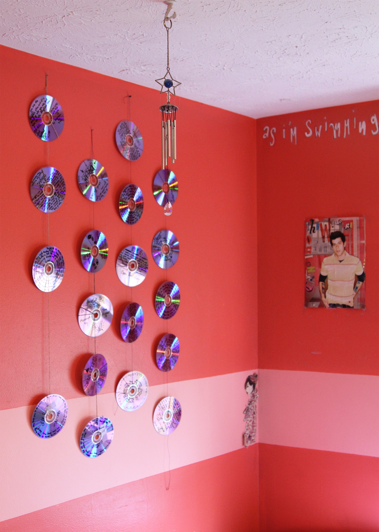 Perched on a shelf was the pink lava lamp my parents gave me on the night we moved into our two-story Colonial when I was 8, likely to soothe my fears about being in a new place. There were Polaroids, photobooth strips, graduation tassels, and seashells collected from summer vacations in Wildwood, New Jersey. And, of course, the pièce de résistance, a DIY wall mobile made out of blank CDs scribbled with song lyrics in black Sharpie (the clichéd, but classic “Don’t Stop Believin’” being one of them), that still dangled over my bed.