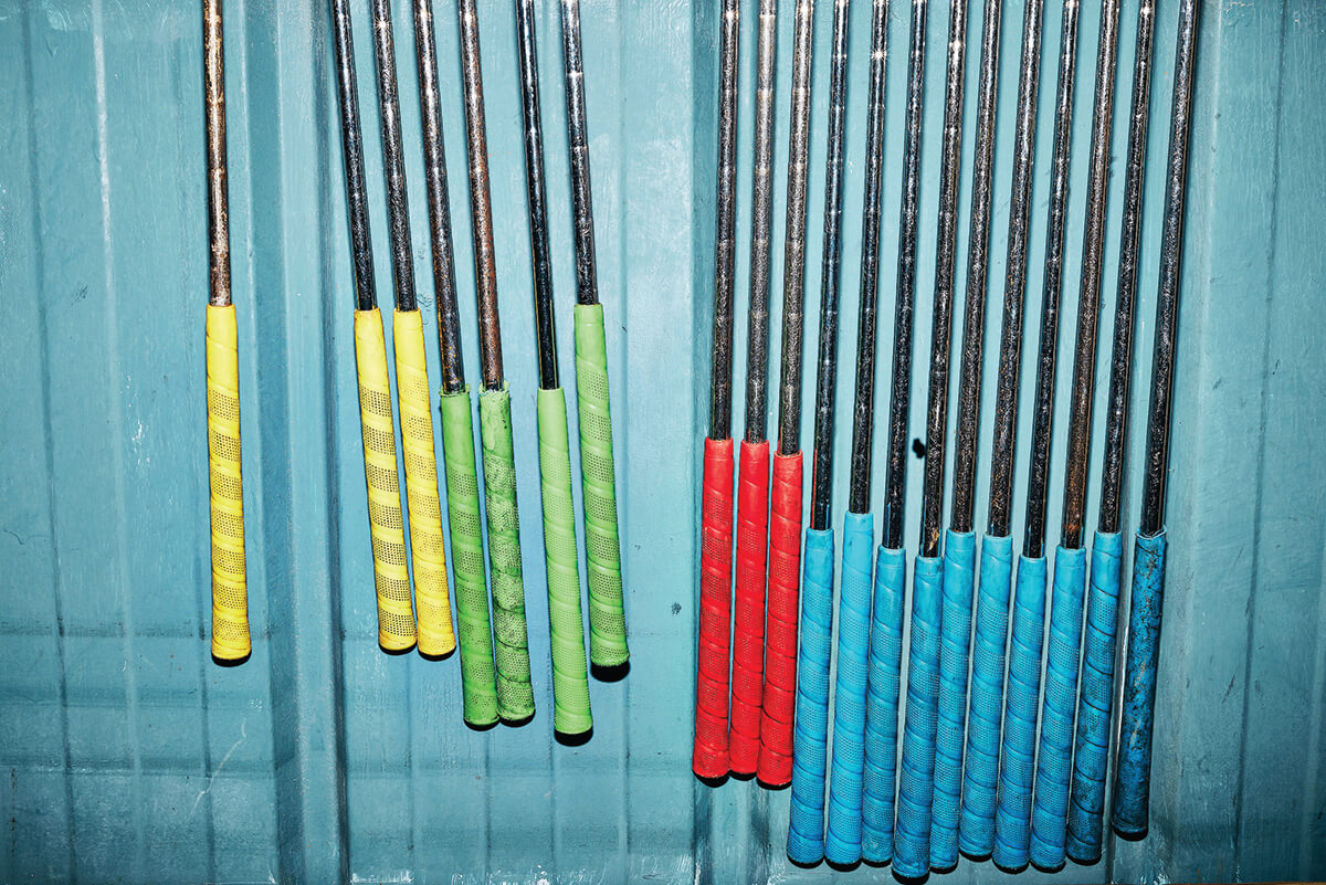 and a wall of colorful putters at Game World in