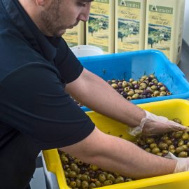My travel companion and I hurry to roll the edges of the tarp inward, pooling the olives in the center. Next, we hold open burlap sacks for Abni to fill with the olives. Seemingly without any effort, Abni swings the massive sack over his shoulder and dumps it onto the pile he has already collected. Moving the tarps to the next tree, we begin again. The work is strenuous, but exhilarating.