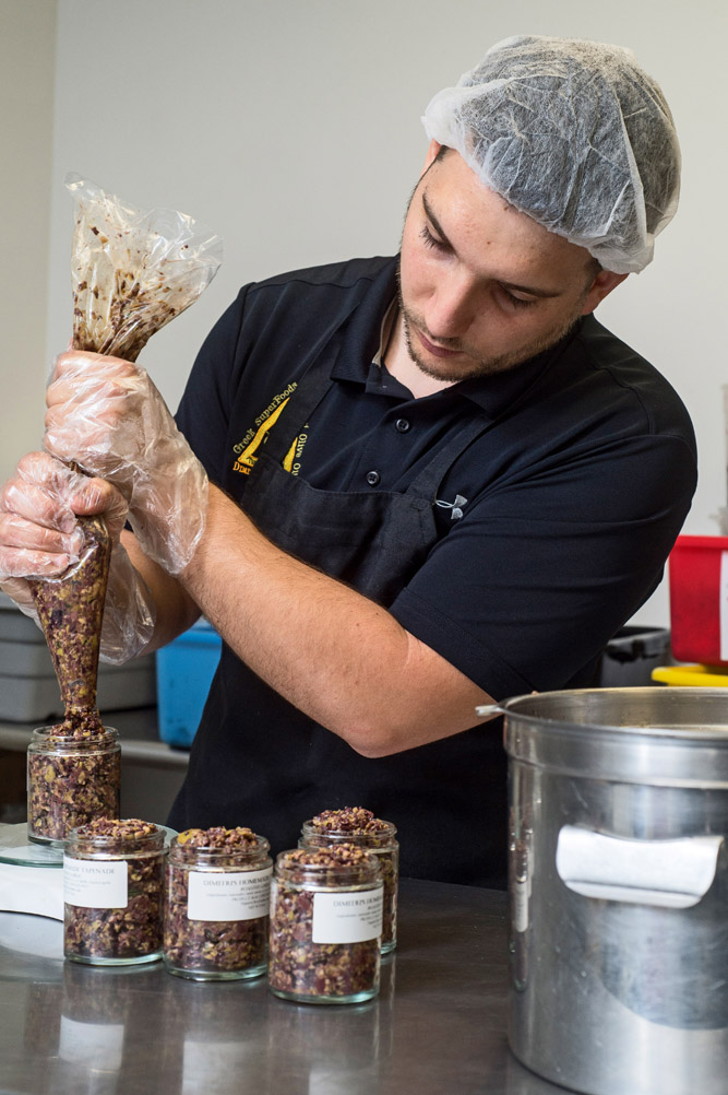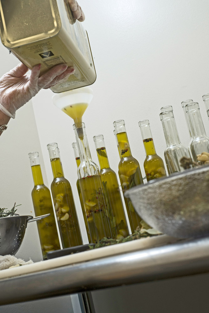 Three months later, a world away from Tarapsa, I meet Dimitri and his family in his Baltimore County commercial kitchen, where he infuses and packages the oil. Although all of the kids were born in Greece, they chatter in English. Dimitri’s 26-year-old stepson, “Little Dimitri,” has created the company’s new website. He busies himself making garlic-infused tapenades, and feta cheese and pepper spreads with olives and cheese from Southern Greece. Dimitri’s sister, Paula, infuses bottles of oil with fresh herbs such as rosemary. His son, Omiros, who works the farmers’ markets in Northern Virginia, labels everything. His wife, Naya, who isn’t at the kitchen on this day, works Saturdays at the Bel Air Farmers’ Market. In November, the kitchen will be moving to a new location on Biddle Street in Baltimore, where Dimitri and the family will operate a Greek deli and market featuring their products and local produce.