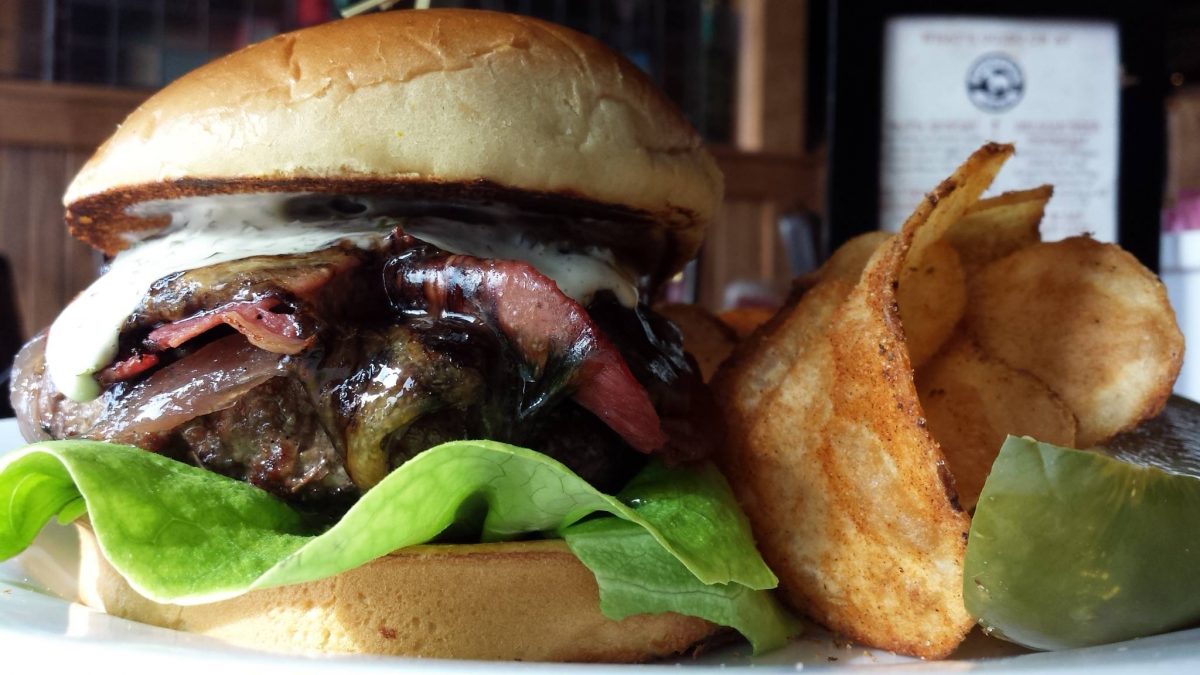The menu, consisting of burgers, crab cakes, salads, pizzas, and an extensive selection of draft and bottled beers, is the same as the other locations.