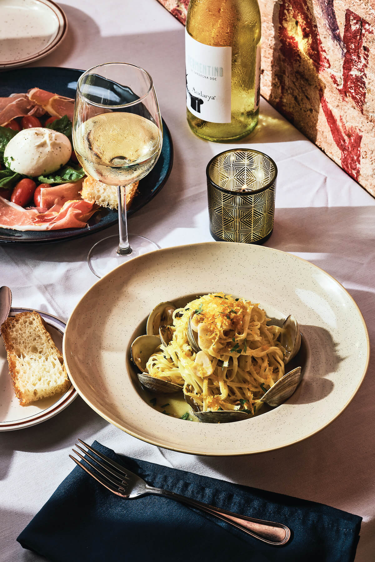 A simple diet is considered a contributor. As such, you’ll find dishes like a regional preparation of linguine vongole, featuring a mound of bottarga, which Useli calls Sardinian caviar. Tangles of fresh-made pasta, glistening in a white wine sauce and surrounded by castanet-sized clams, get a salty kick from the dried fish roe.
