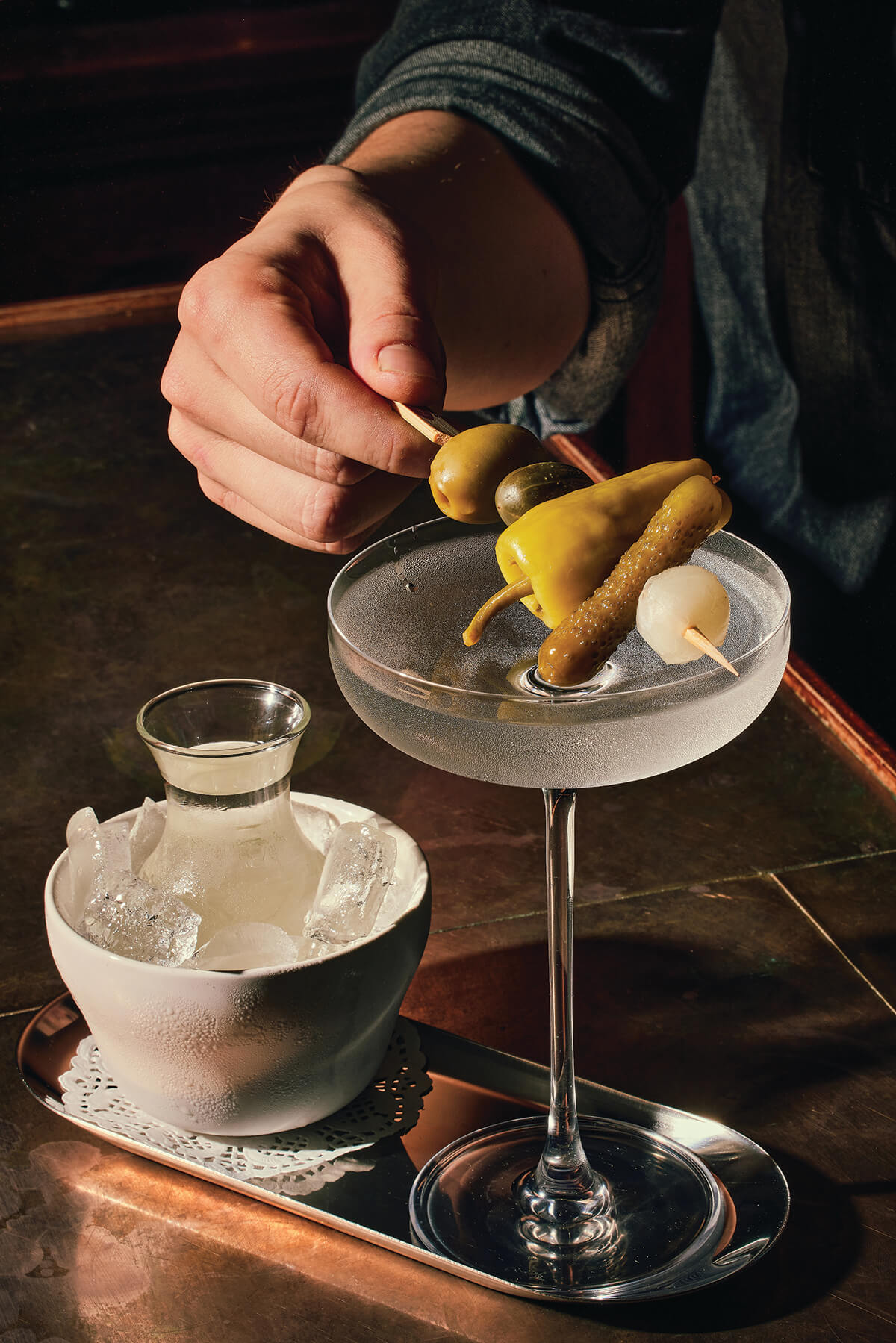 When the renovated biker bar reopened in the fall of 2018, Tiffany leaned into nostalgia by serving the drink (4 to 4 1/2 ounces of gin or vodka), its accompanying sidecar (another 4 ounces of alcohol), and a quintet of skewered garnishes (pepperoncini, cornichon, olives, pickled onion, and a caperberry) as an homage to the past.
