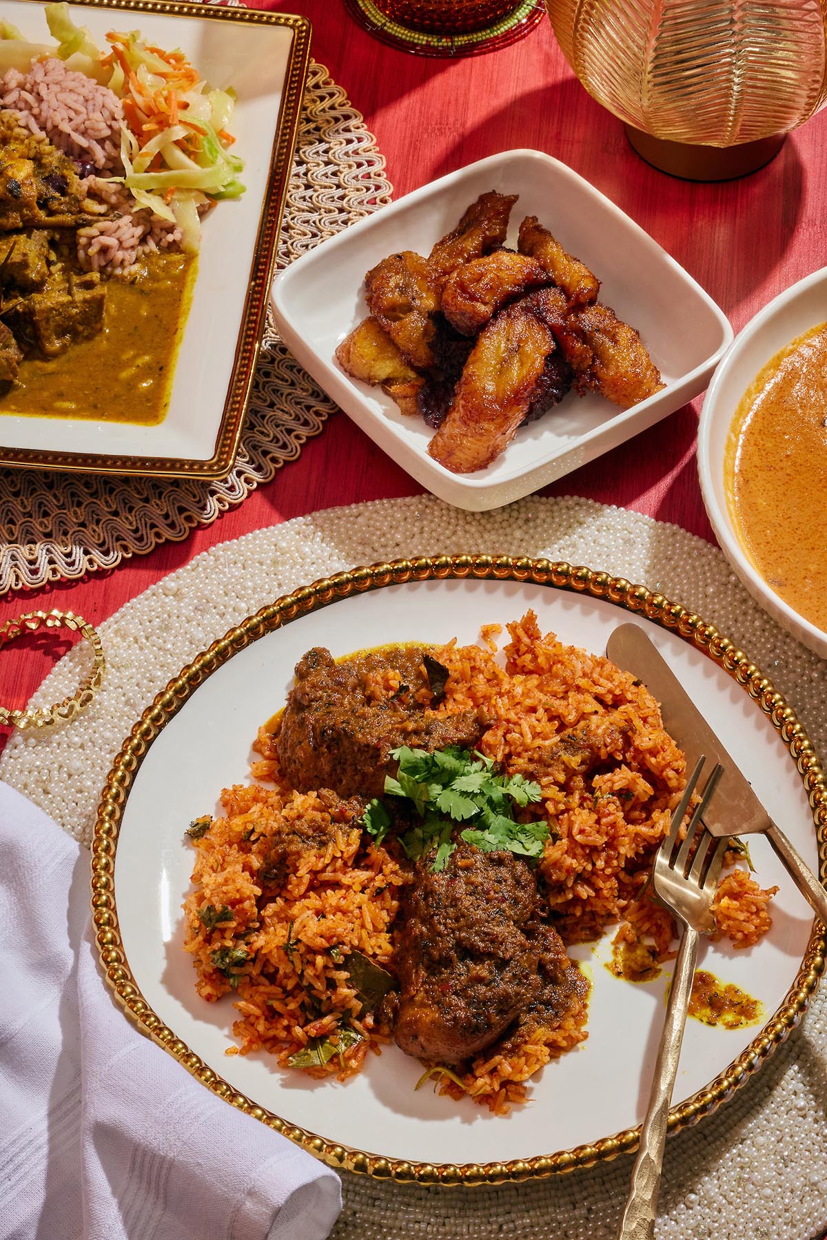 The cooking prep here is rustic, with an emphasis on slow-cooked stews and fall off-the-bone meats. Just about everything is served with rice because, as Sackey points out, it’s used as a staple around the world. She relies on garlic, onions, turmeric, Scotch bonnet chile peppers, and warm Indian spices like cumin and coriander to flavor her various dishes.