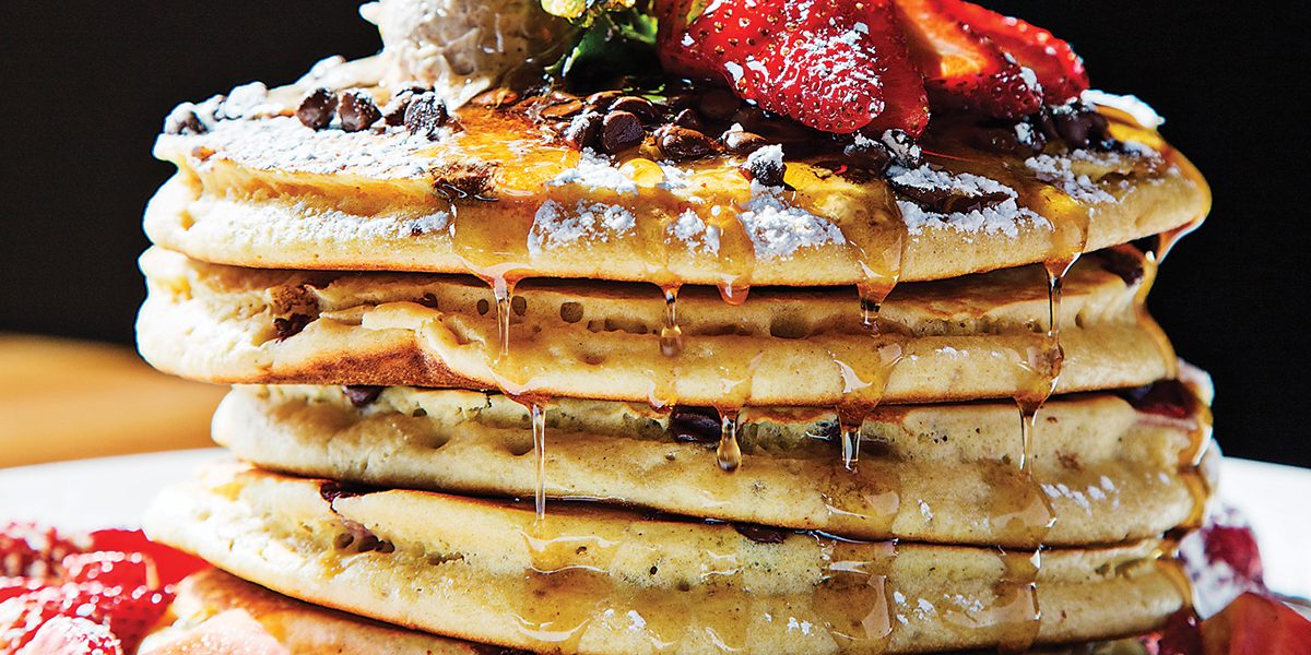 Because breakfast is the most important meal of the day, we settled on chicken and waffles ($14.95), the brisket “Benny” ($13.95), and chocolate-chip pancakes with strawberries ($11.93). (Brunch is no time to be virtuous—and we weren’t.) Everything we ordered was above par, though some dishes suffered from too much of a good thing: The pancakes were fluffy, but arrived dusted with powdered sugar and extra chocolate chips, plus a dollop of maple-bourbon butter.