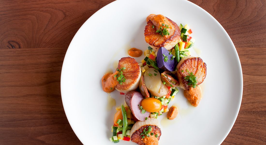 Witness the three-beet salad, a lovely version of this requisite menu item. One Eleven’s is gorgeous to behold: Diced golden beets mix with deep green watercress, orange segments, spicy goat cheese, and walnuts atop an emulsion of red beets, while translucent slices of candy-striped chioggias decorate the plate. Similarly handsome (and unctuously delicious) was an appetizer of butter-poached pork cheek with creamy polenta and an unexpected spark of kimchi to cut the richness. Four baked oysters arrived bubbling with a topping of blue cheese, guanciale butter, and bacon, while whole tentacles of grilled octopus are crispy on the outside and tender on the inside, dressed with citrus dressing.