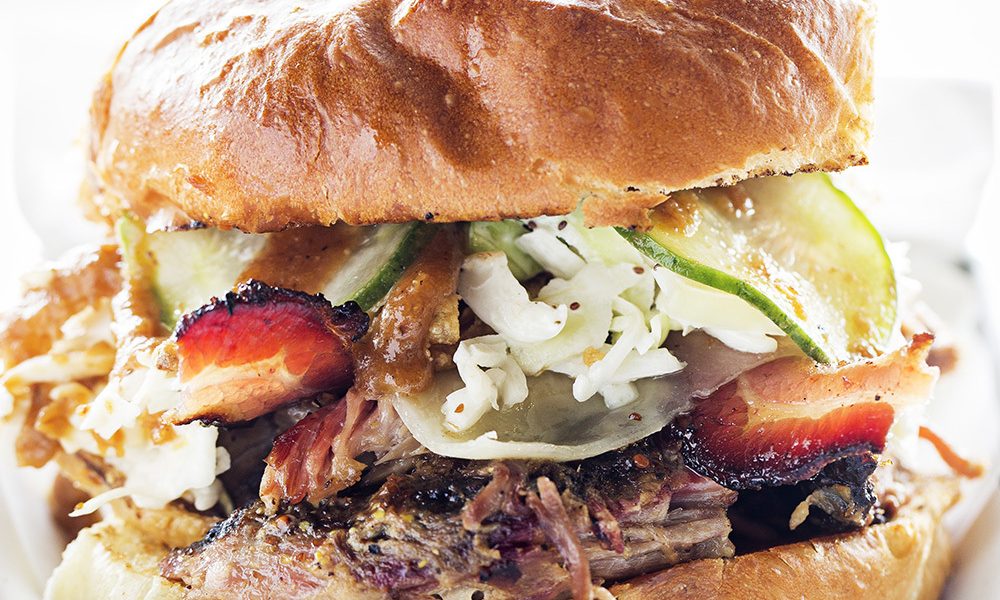 Smoke offers seven sandwiches, including smoked-then-fried bologna ($8) and a fried green BLT ($9) you’d be hard-pressed to find on other menus. We tried the Boss Dawg ($14), a heaping helping of pulled pork, bacon, crispy onions, pickles (made in-house), cheddar cheese, jalapeño-bacon glaze, and coleslaw somehow stuffed between a grilled bun. White doesn’t serve most of his ’cue slopped with sauce, so we ate half of the sandwich dry, then slathered on some of his house-made jalapeño-pineapple barbecue sauce. Both versions were crunchy, smoky, meaty, and messy—in other words, delicious.