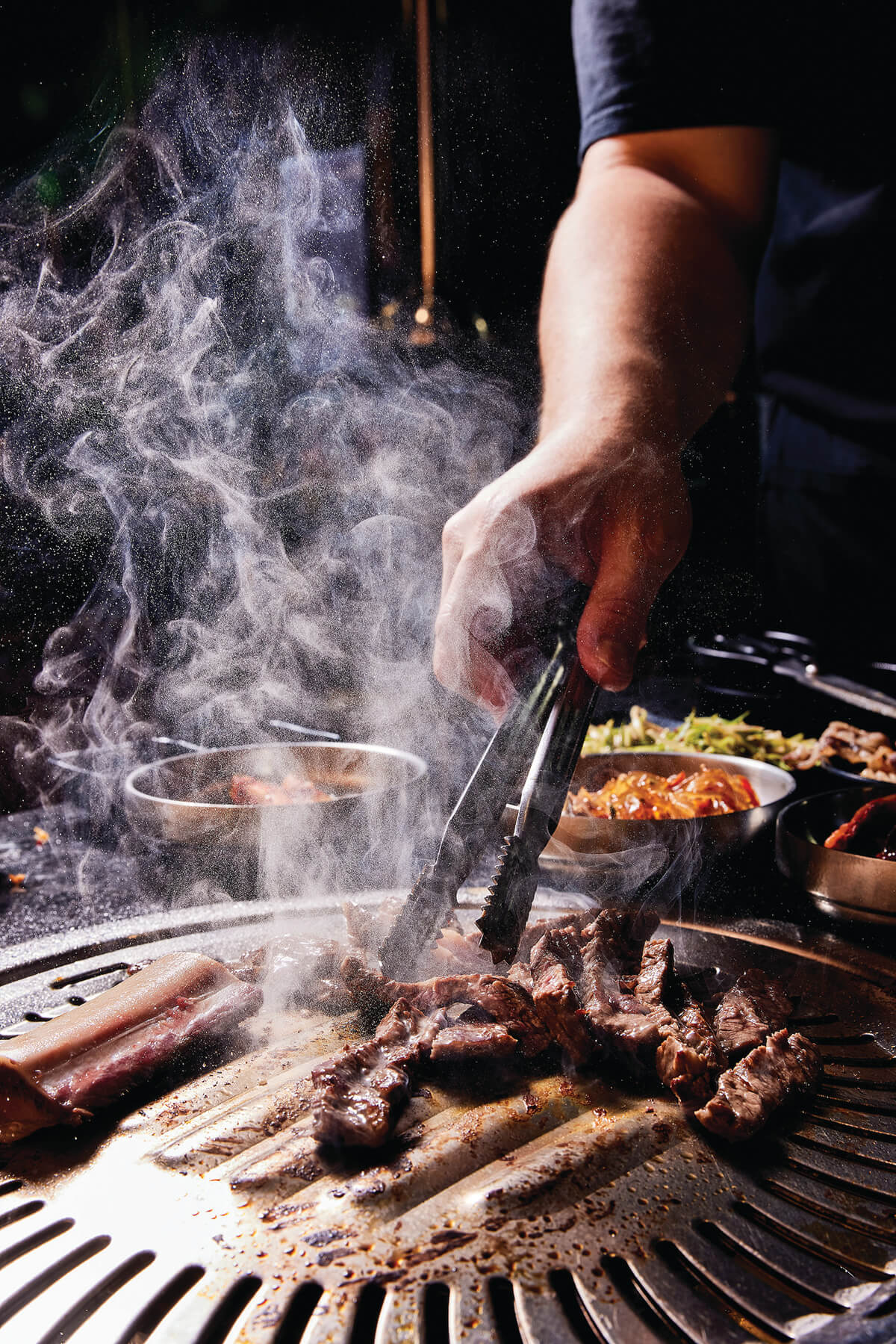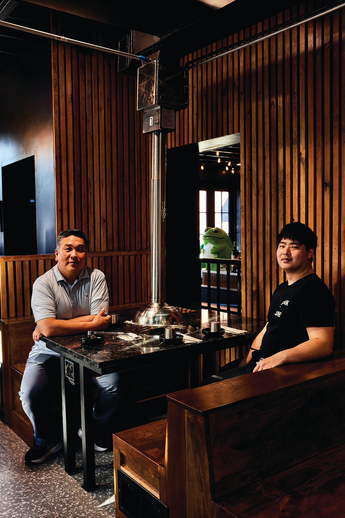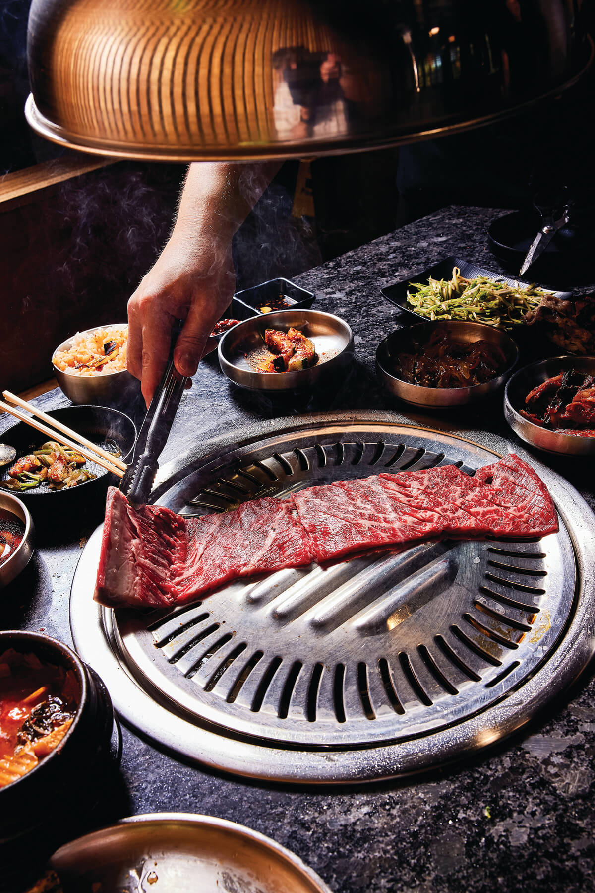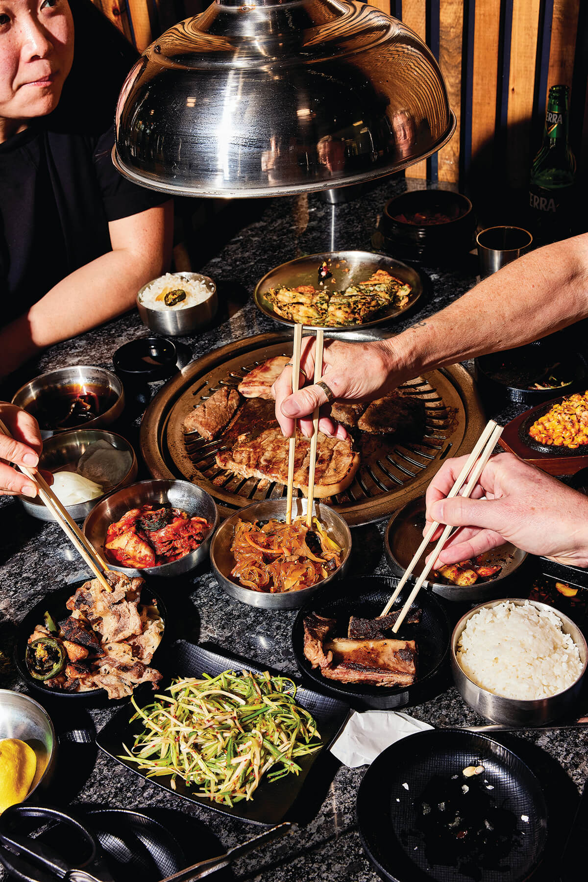 “My parents are into it as well,” says Kevin of his uncle’s restaurant one evening, as he expertly scissors sizzling pork belly, brisket, and bone-in short ribs under one of the vertically moveable vents that make the restaurant look less like a KBBQ joint than a Quentin Tarantino set.