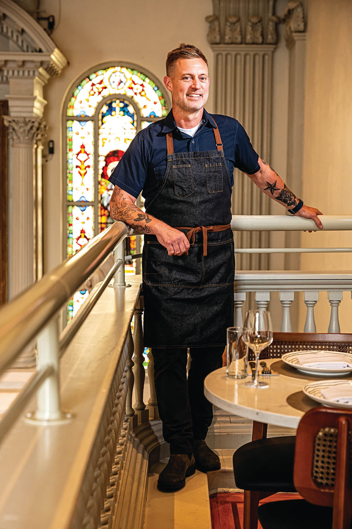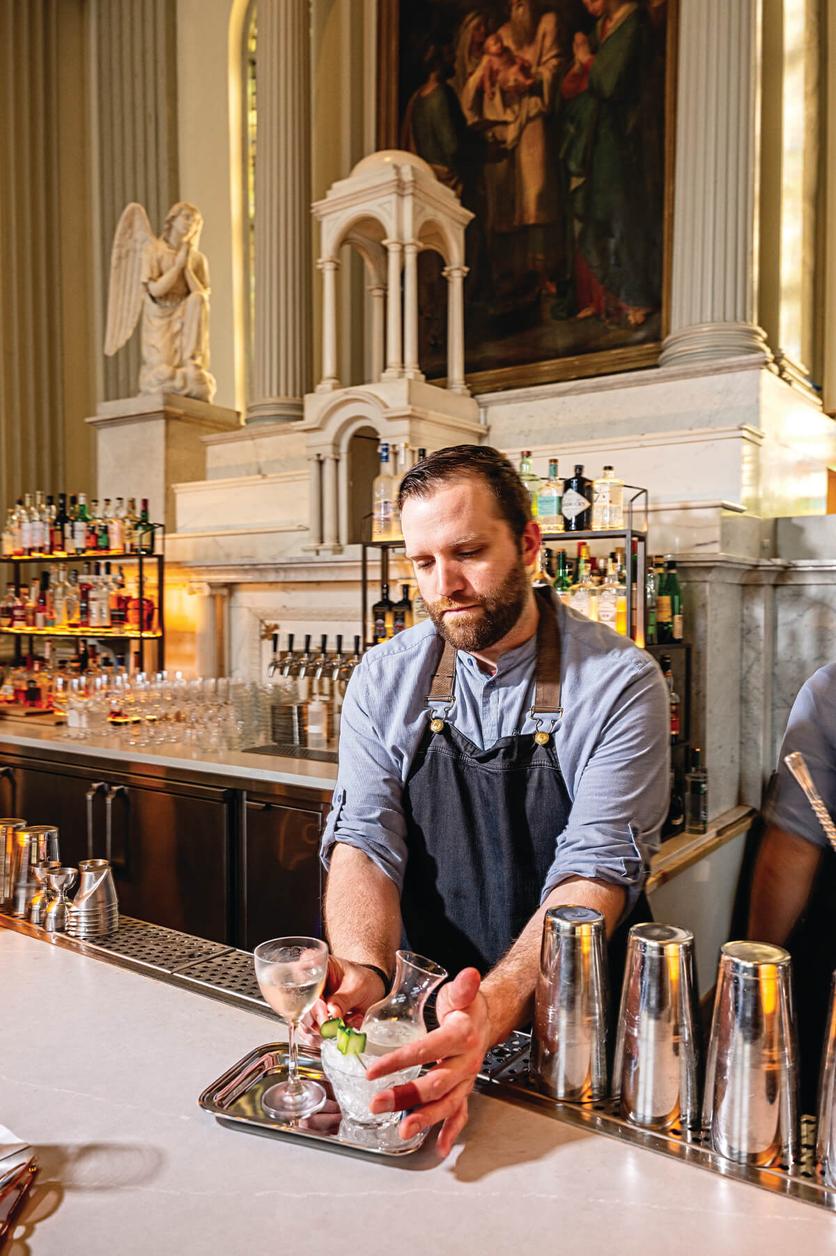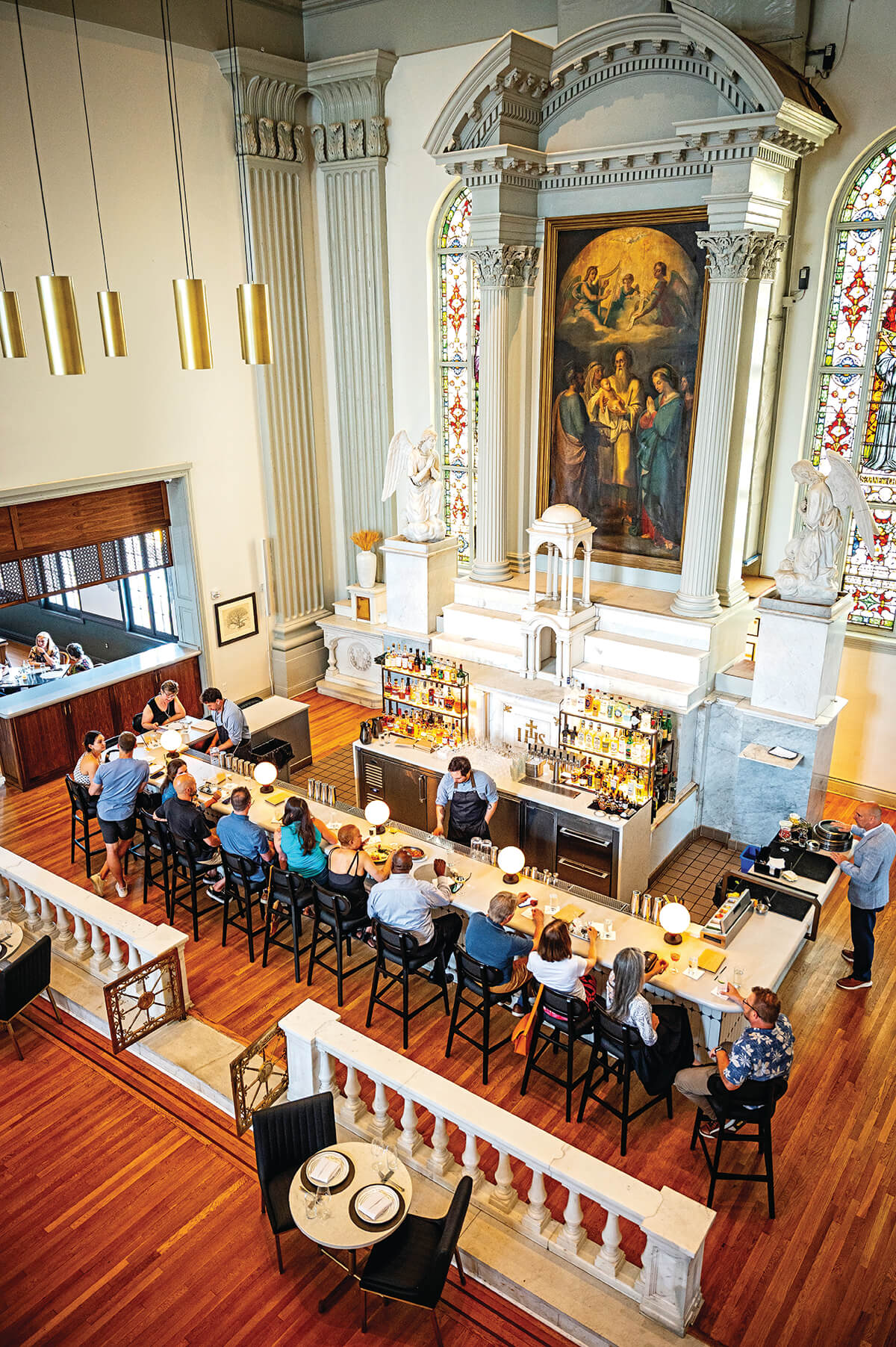 Given that sharing, celebration, and community are at the heart of dining, it’s an apt metamorphosis for the 1852 historic church that has not been a place of prayer since 2016. The church theme décor is well-executed without being overwrought—the altar is now a well-stocked bar with a top-tier list of spirits including a selection of creative martinis (the aptly named Garden martini with its vegetal St. George Basil Eau de Vie Brandy was a standout); the nave is now a striking dining room with teal textiles and original stained glass by noted German craftsman Franz Mayer.