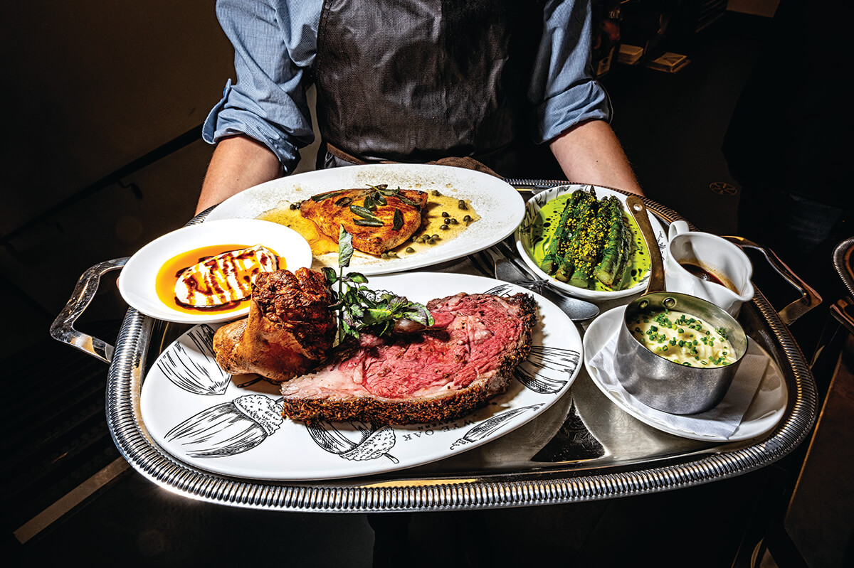 Wye Oak focuses on steaks—be it a filet mignon, a New York strip, a 45-day aged Roseda rib-eye, or a signature slow-roasted prime rib encrusted with garlic and mayonnaise and served with a lofty cheddar popover. (The protein is familiar territory, thanks to their Voltaggio Brothers’ Steakhouse at MGM National Harbor.) The meat is enlivened with a slew of creative sauces, like the pit-beef-inspired Tiger Sauce and a selection of steakhouse-style sides that are stars in their own right (the spiced sweet potatoes are among them).