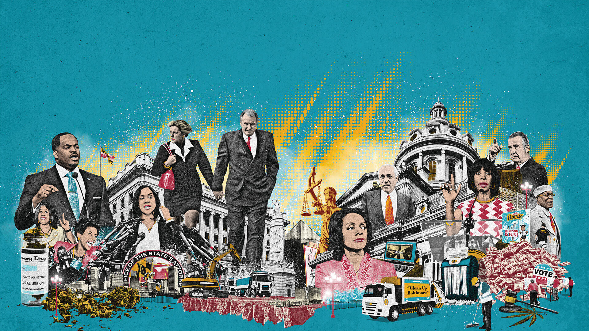 Opening spread: From left, Cheryl Glenn/AP Images, Jacqueline McLean / The Baltimore Sun, Mary Pat and Thomas Bromwell Sr. / Getty Images, Sheila Dixon and Catherine Pugh / Courtesy Of Maryland State Archives; Marvin Mandel and Spiro Agnew /AP Images; Nathanial Oaks / Courtesy Of Rachel Baye, WYPR; Shutterstock