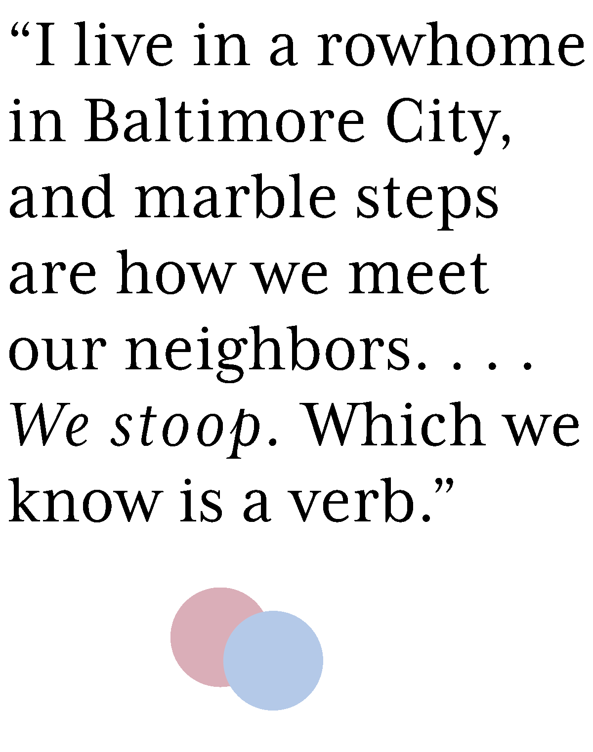 “I live in a rowhome in Baltimore City, and marble steps are how we meet our neighbors,” says Martorana. “I’ve lived next to some for over 15 years, and I’ve barely been inside their houses. But we see them outside—we stoop. Which we know is a verb. These stairs are basically outdoor furniture. And believe it or not, they’re comfortable. Ours face west, and after a sunny day, they’re still warm in evening.”