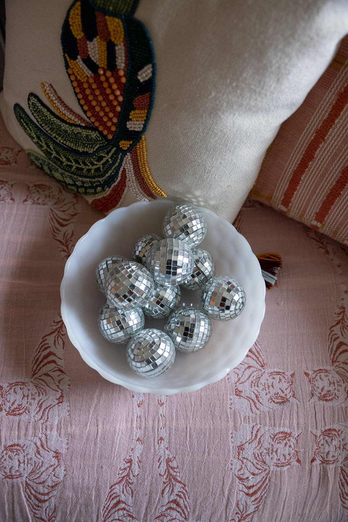 THE 1970S CALLED: My favorite pieces include a cobra chair—a big ’70s wicker chair with a huge high back that looks like the head of a cobra. I scored it on Marketplace for an unbelievable price. It’s a total unicorn. But my favorite are the disco balls. Nothing uplifts the serotonin more than the sun hitting the disco balls throughout the day.
