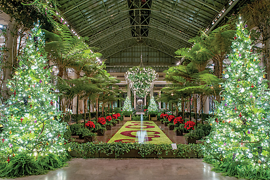 For starters, a half-million outdoor lights glow on more than 125 trees, lighting up daily at 3:30 p.m. and reflecting off the water of the property’s scenic lakes. Adding to the spectacle are the garden’s famed fountains, timed so they seem to dance to the seasonal music from the 10,010-pipe Aeolian organ (designed for Pierre du Pont in 1930), and holiday music also rings out from the 62-bell carillon within the Chimes Tower. Carolers are on hand to add to the merriment. Other holiday touches include a G-scale outdoor model train garden.