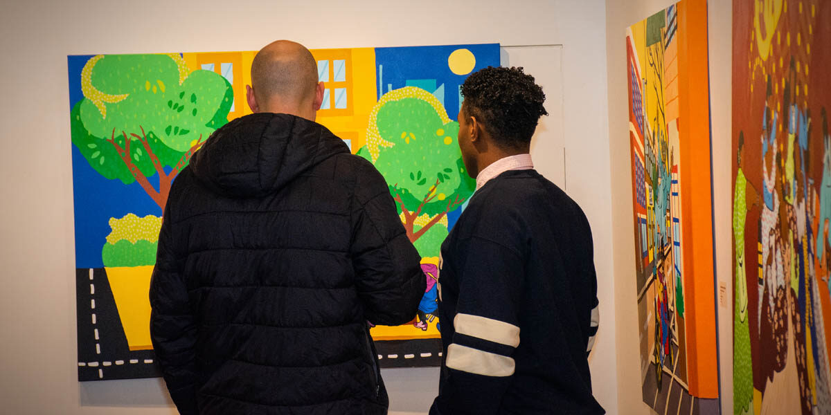 Left to right: VILLAGER, exhibiting artist (artwork behind him); Shane Cromwell, digital content producer; Kehinde Applewhite, exhibiting artist (artwork to her right); Hannah Shaw, Wide Angle Youth Media communications manager