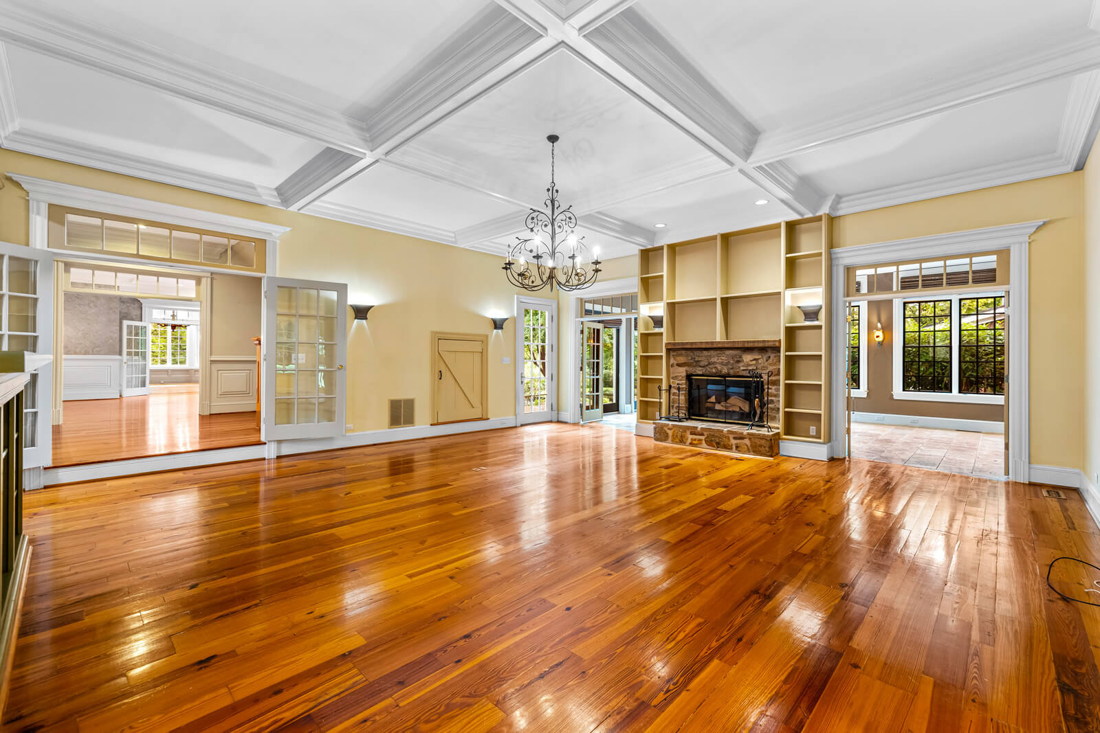 The upper level houses the primary suite, a retreat with a coffered ceiling, fireplace, and dual bathrooms, one with a steam shower and the other with a luxurious soaking tub. A spacious dressing room and a private office complete the suite. Two additional large bedrooms share a bathroom on this level, while the third floor offers two generously sized bedrooms and another full bath. Each room is designed with care, featuring beautiful, reclaimed pine flooring and thoughtful architectural details.