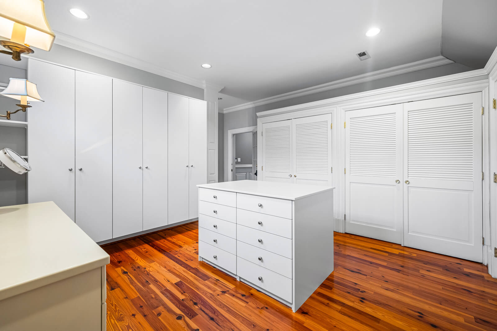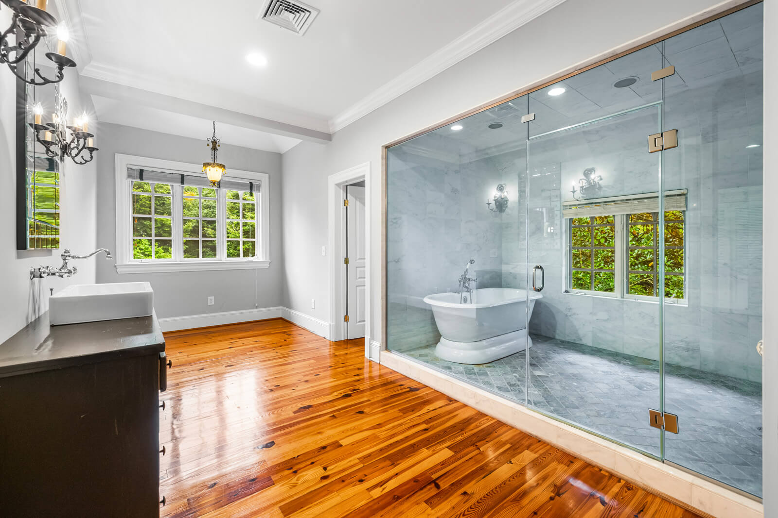 The main level offers a formal living room, which opens through French doors to both an office and the formal dining room, complete with a stone fireplace and a bay window view. The family room, also featuring a fireplace, flows seamlessly into a sunroom with marble floors, offering an inviting space for relaxation. The gourmet kitchen is a chef’s dream with two large islands, granite counters, and high-end appliances, including a Thermador 6-burner gas cooktop and Sub-Zero refrigerator. Just off the kitchen is the breakfast room, where picture windows provide serene views of the surrounding landscape, and a door leads to the side porch for easy outdoor dining.