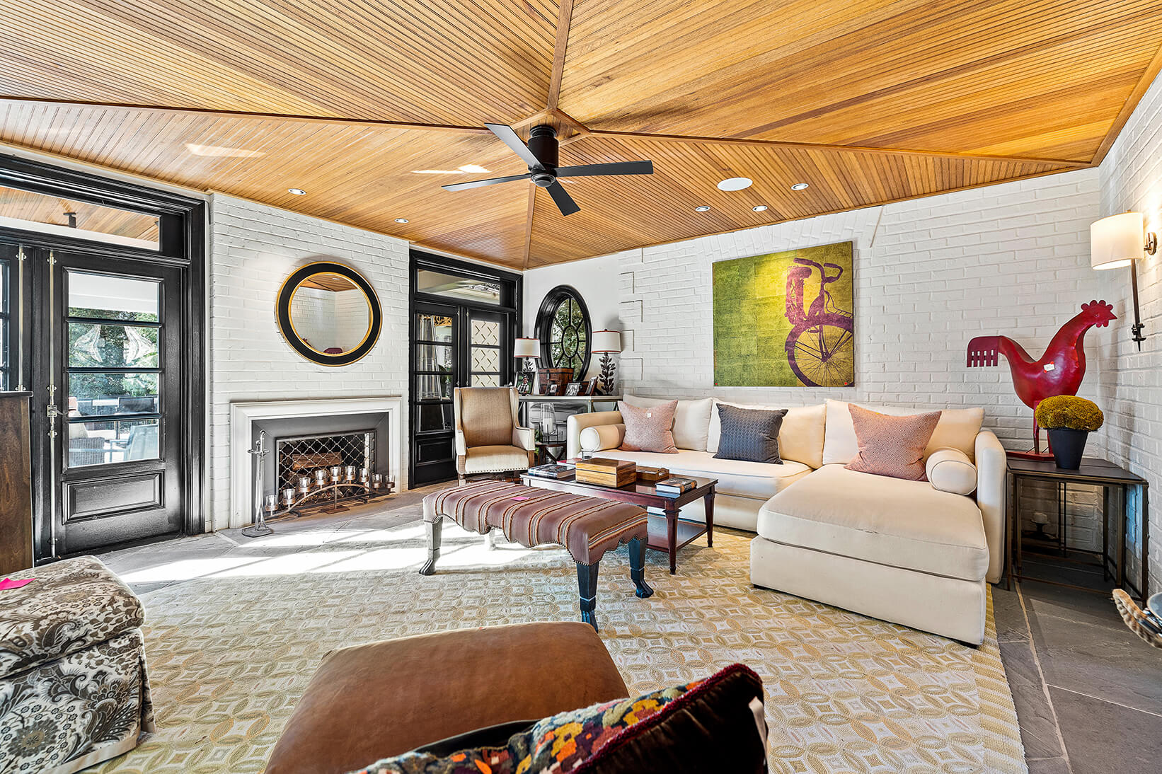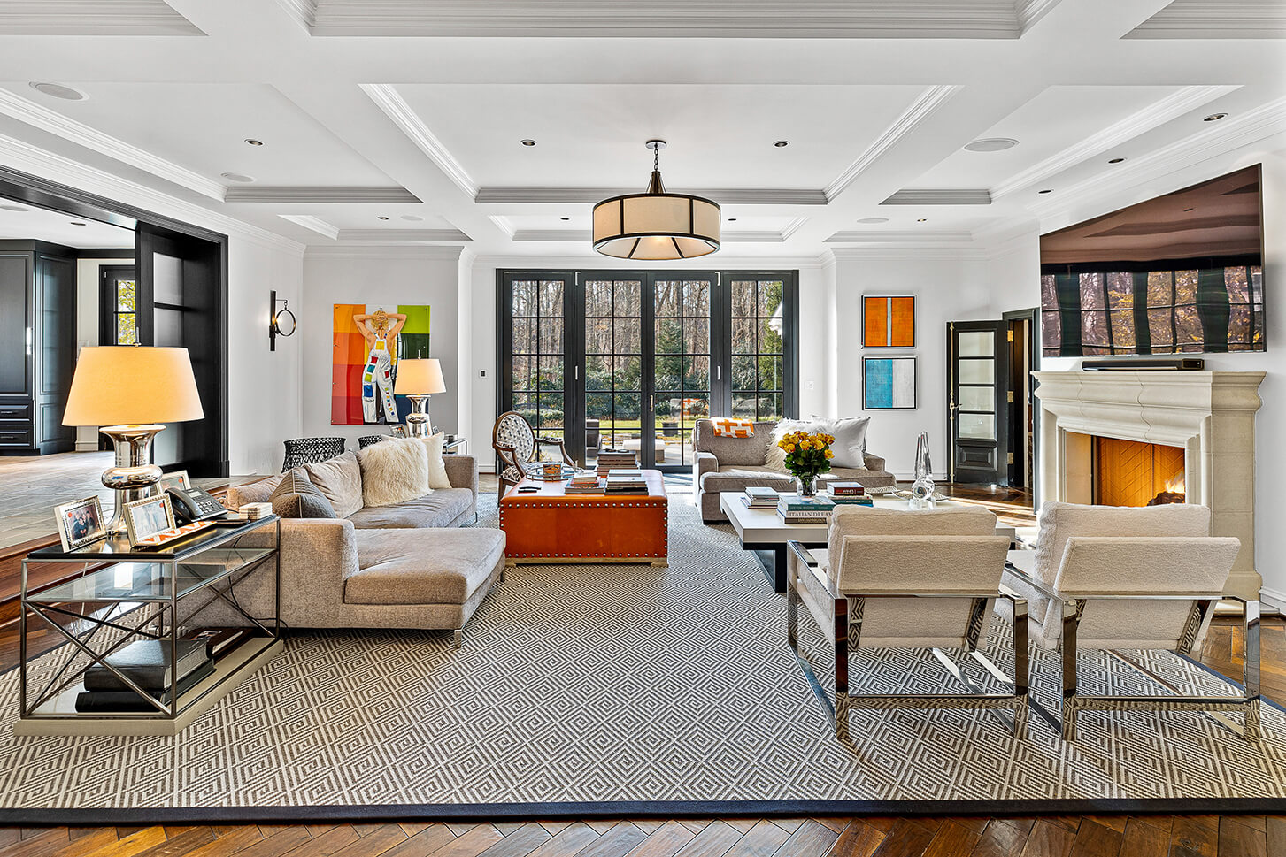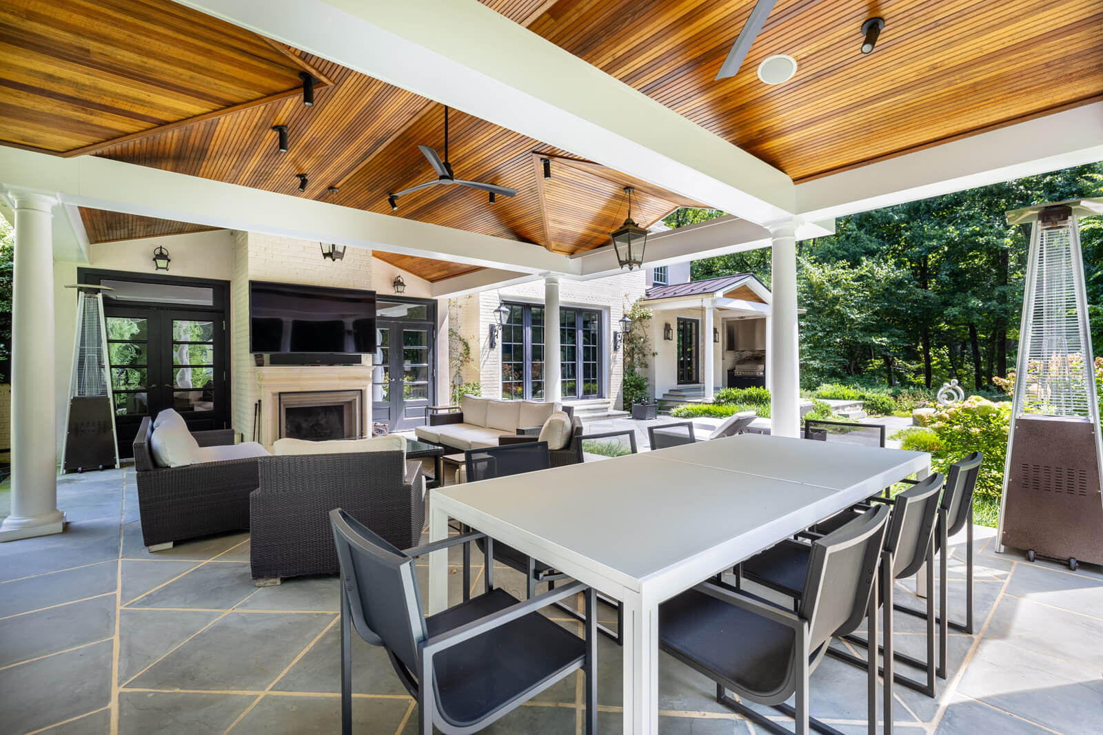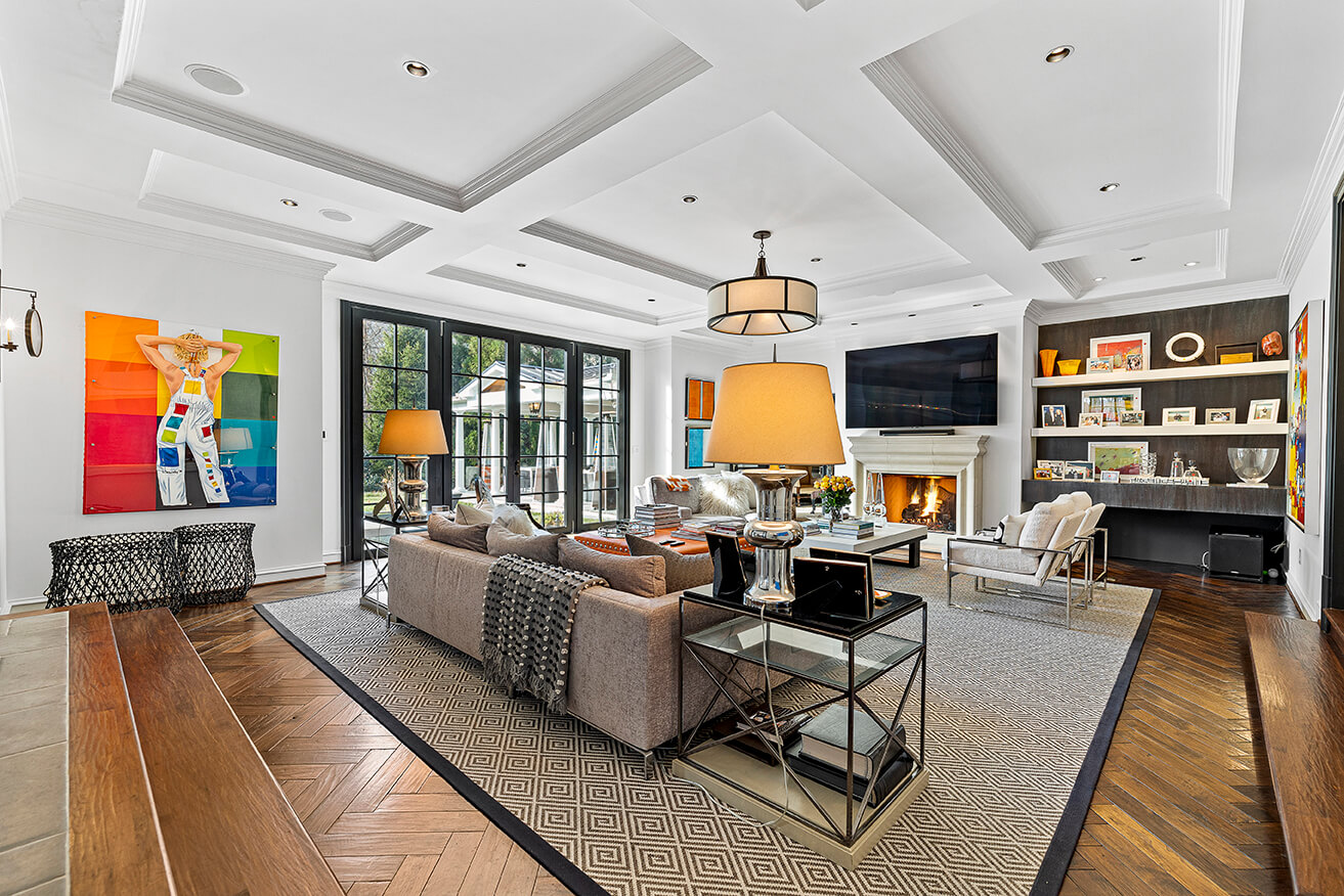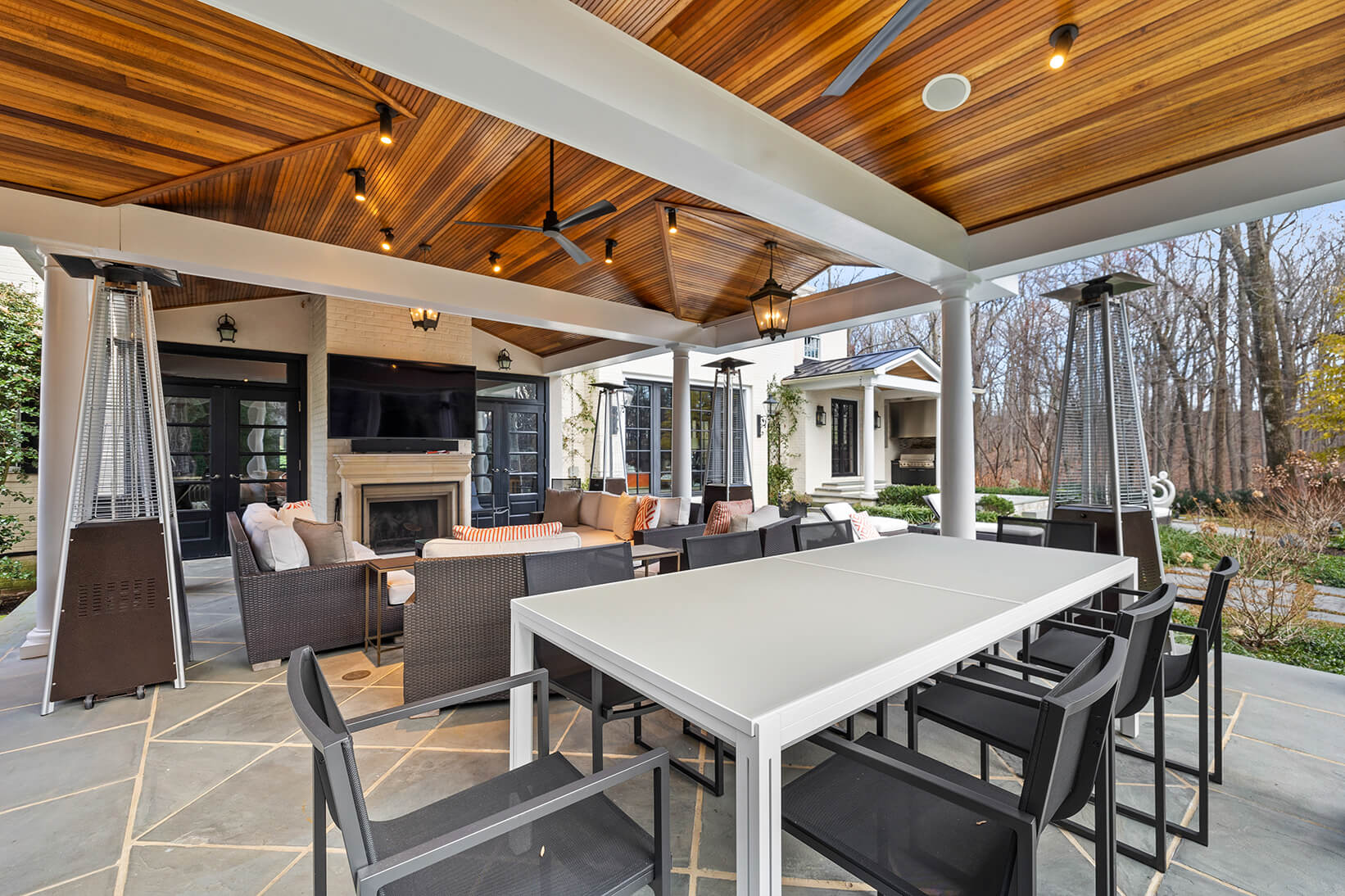 The kitchen, a stunning addition, features natural stone floors, quartz counters, and top-of-the-line appliances that elevate the culinary experience. The great room is a haven of comfort, with a cast stone fireplace, coffered ceiling, and built-in surround sound, while the cozy den is perfect for intimate gatherings, with its fireplace, archway to the bar, and French doors that open to the enchanting pavilion. The main level also includes a home office with built-ins, two powder rooms, a laundry room, and an oversize 3-car garage.
