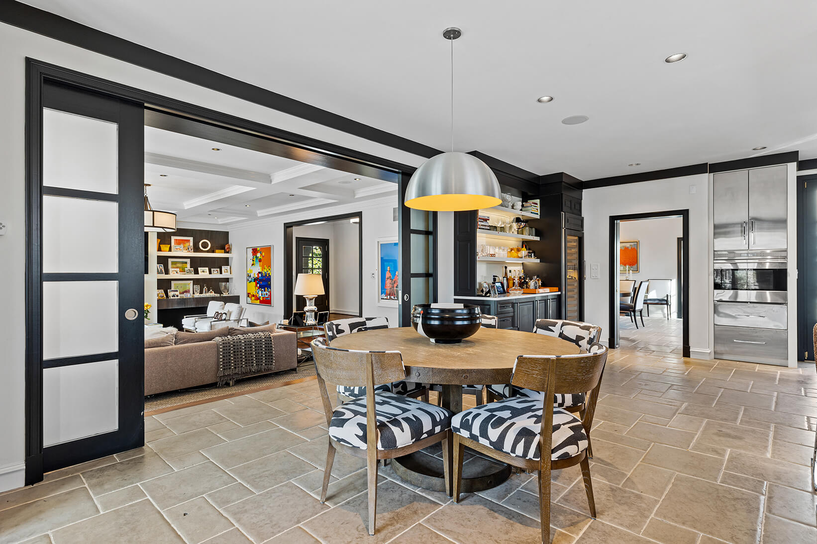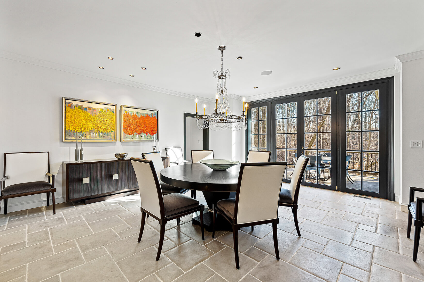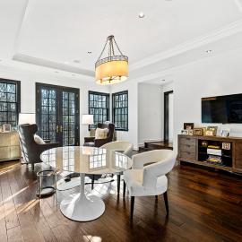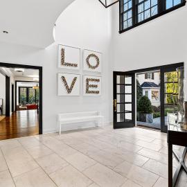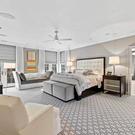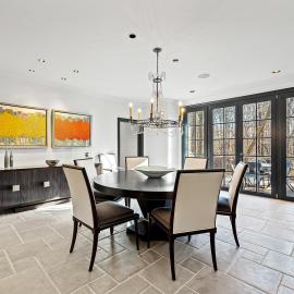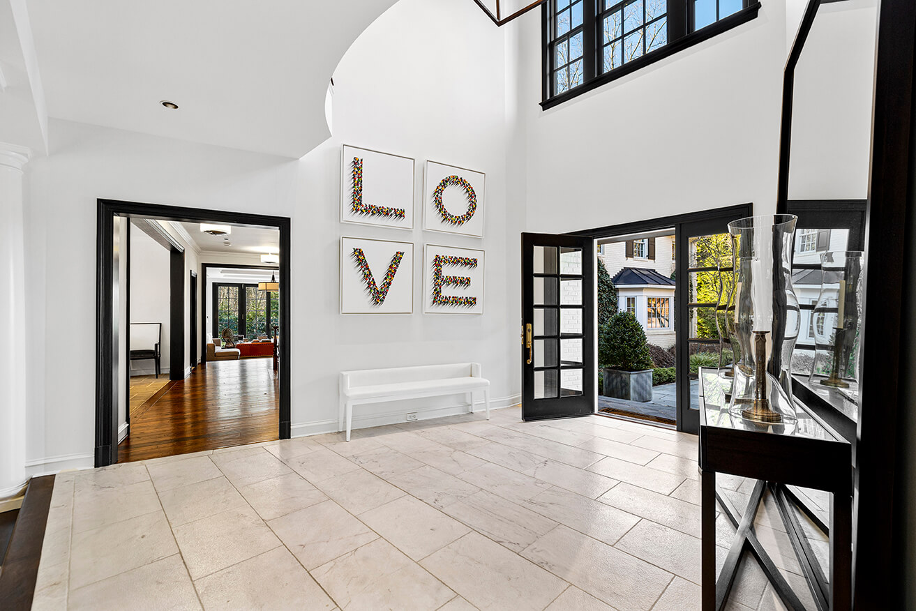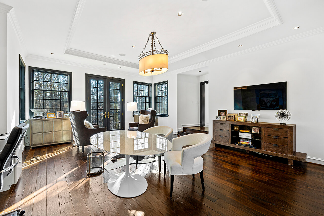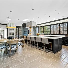 Recently expanded and renovated, the home is impeccably maintained, boasting finishes crafted with the finest materials, including hand-scraped walnut floors that exude warmth and character. With six bedrooms, five full and four half baths, and a guest annex/private office complex, this home offers an array of luxuries fit for any lifestyle. Upon entering, guests are welcomed by a grand two-story marble foyer that flows gracefully through classic columns to the living room. The stair hall is adorned with open curved staircases and a wide portal that leads to a formal dining room with a natural stone floor and French doors that open to a charming deck.