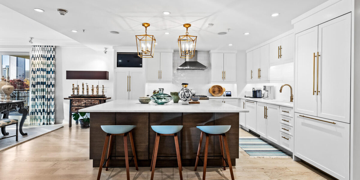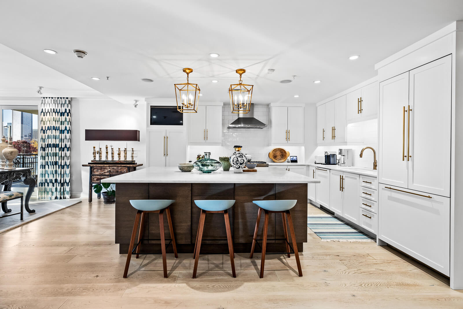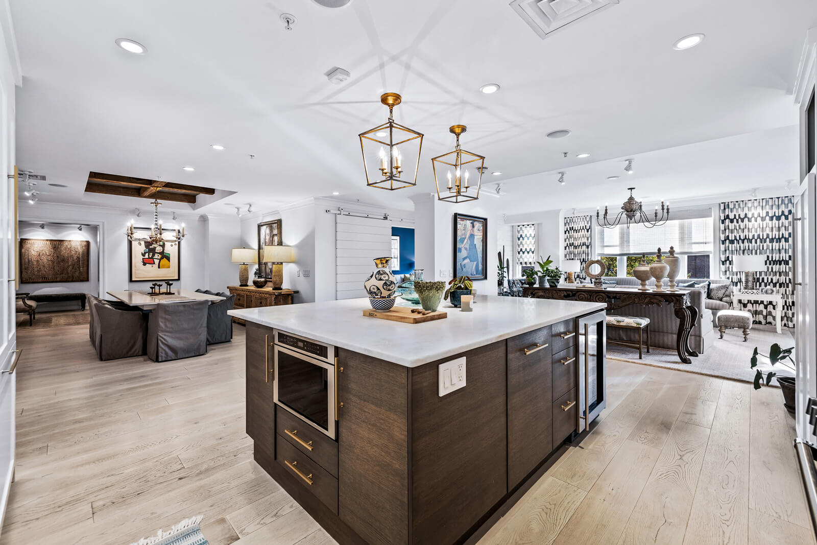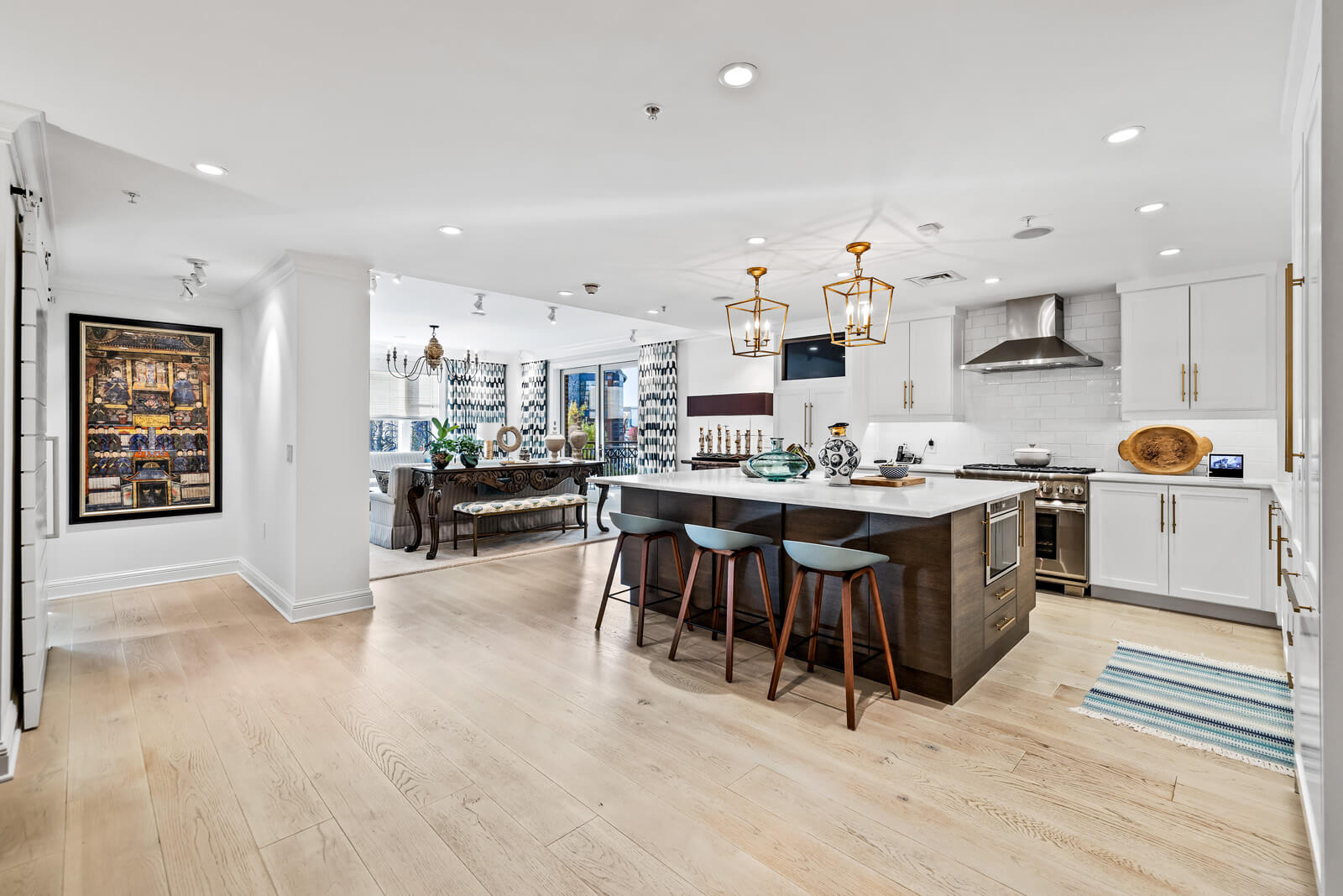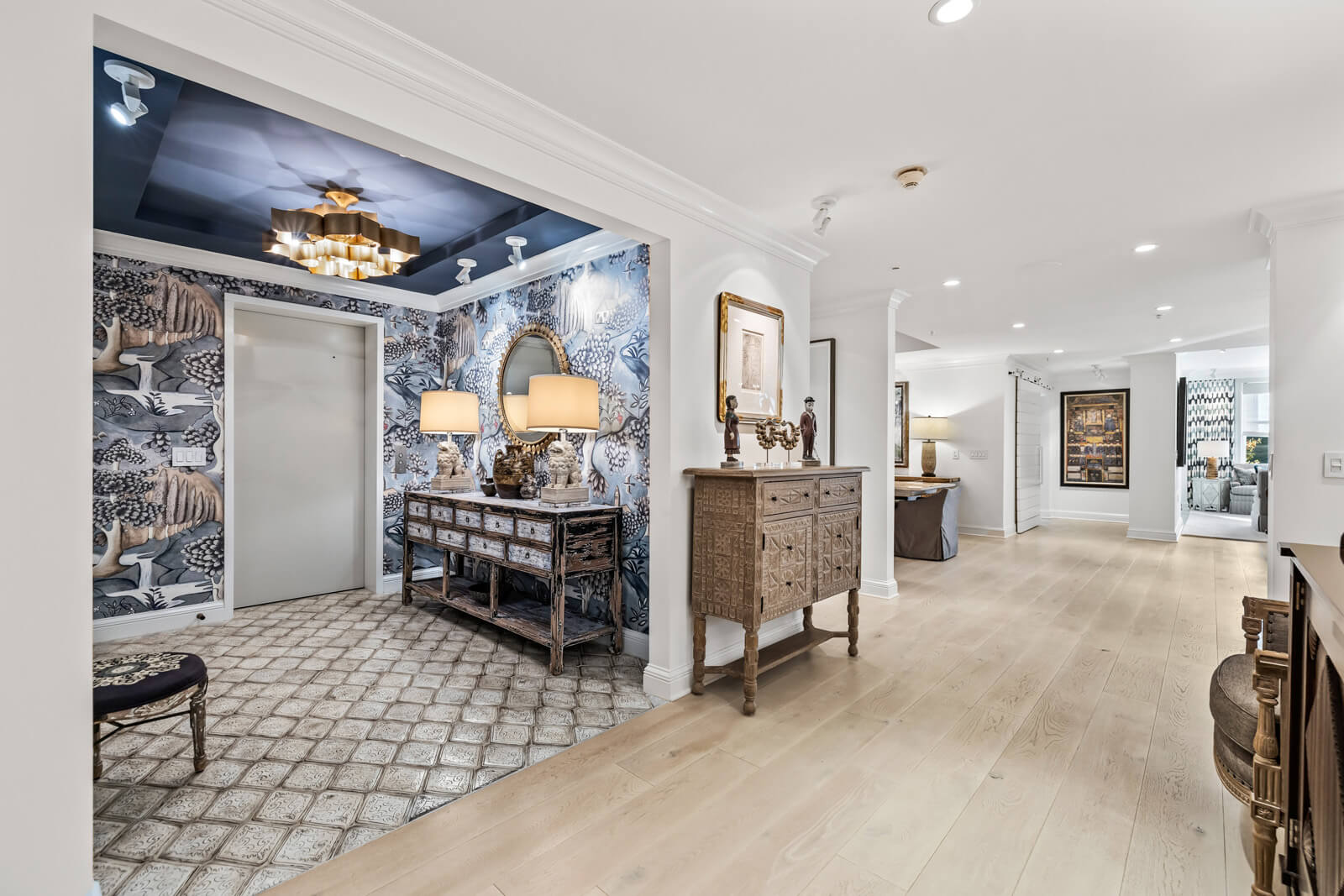 Embark on a journey of modern luxury at this superbly renovated unit in the Ritz Carlton Residences. Located along the scenic promenade, this expansive 3,351SF home welcomes you with a blend of contemporary elegance and comfort. The private elevator opens to a foyer adorned with designer ceramic tile flooring and a tray ceiling with crown molding, introducing the refined ambiance that permeates throughout. The hall, featuring sleek white oak flooring and stylish crown molding, leads seamlessly to the living spaces, including a chic powder room with marble flooring and an antique chest vanity.