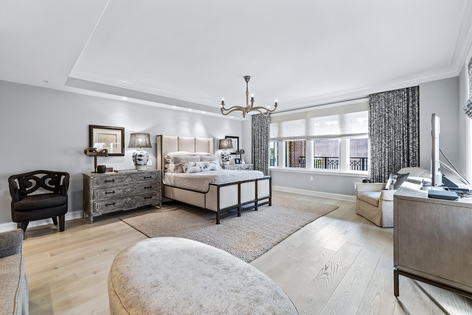 The den, which doubles as a third bedroom, features a custom sliding barn door and a private bath with a marble floor and modern vanity. The primary bedroom suite is a sanctuary of its own, with a private hall entry, luxurious dressing room, and a spa-like primary bath featuring chevron pattern marble and a Jacuzzi tub.