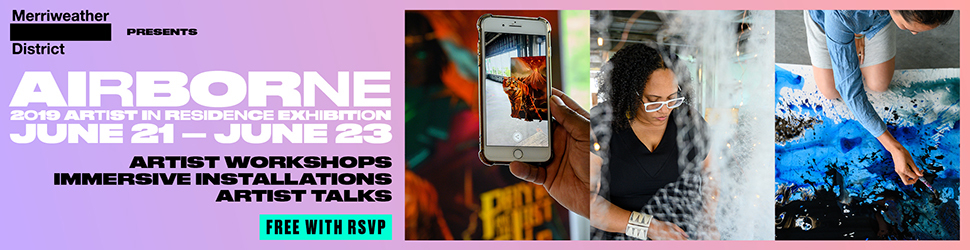 AIRBORNE, open only the weekend of June 21st–23rd, is an immersive art exhibition presenting the works of three artists who have spent the past six weeks in a studio residency in the Merriweather District in Downtown Columbia. Each artist has a unique approach across a variety of mediums addressing cultural questions facing everyone. Featuring a site-specific laser sculpture spanning the length of the 20,000-square-foot studio space, AIRBORNE offers an unparalleled art experience.